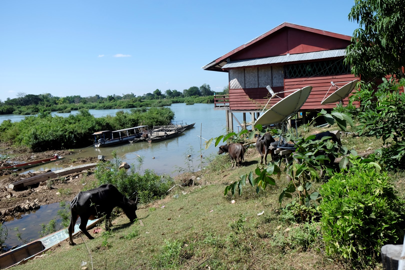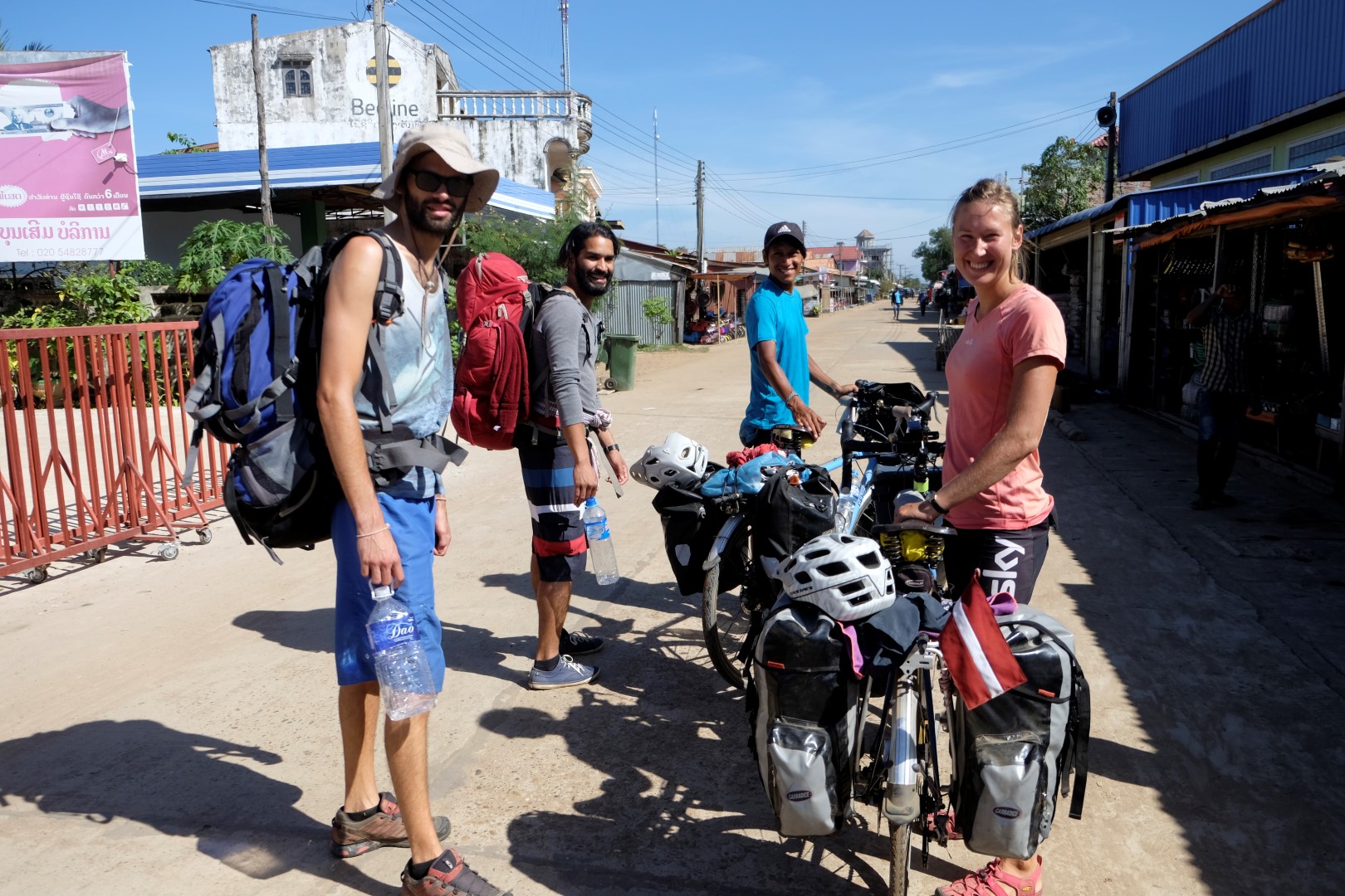 Tā nu mēs pāris stundas pavadām briesmīgas mūzikas un karstuma sabiedrībā, līdz esam Pakses pievārtē. Līdz centram 8 km. Mēģinām noķert kādu tuktukam līdzīgu objektu, bet šis grib pārāk daudz naudas, tāpēc soļojam uz priekšu kājām. Joka pēc pamēģinām stopēt – pietur glauns pikaps un aizvizina mūs gandrīz līdz centram. Kopčai!