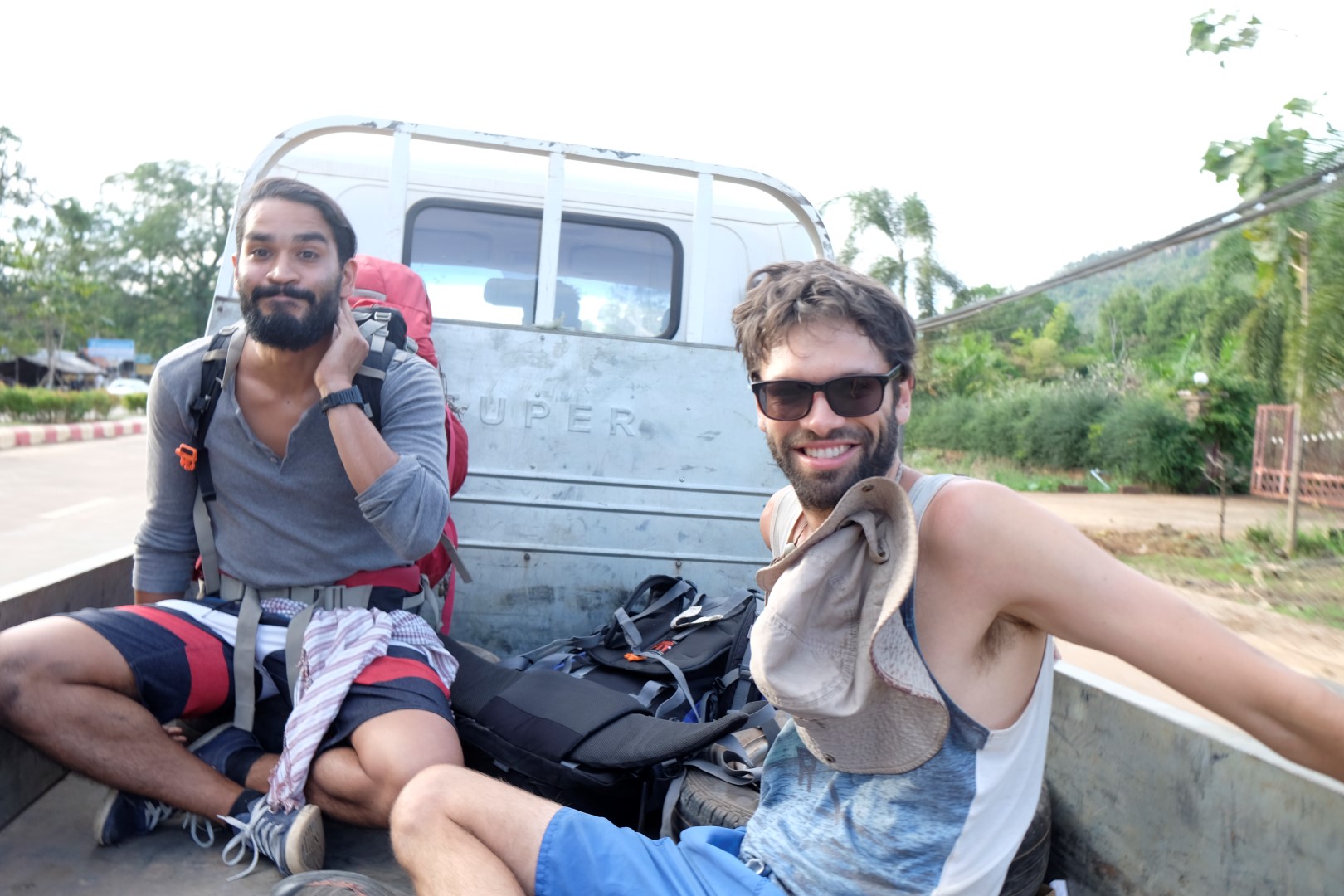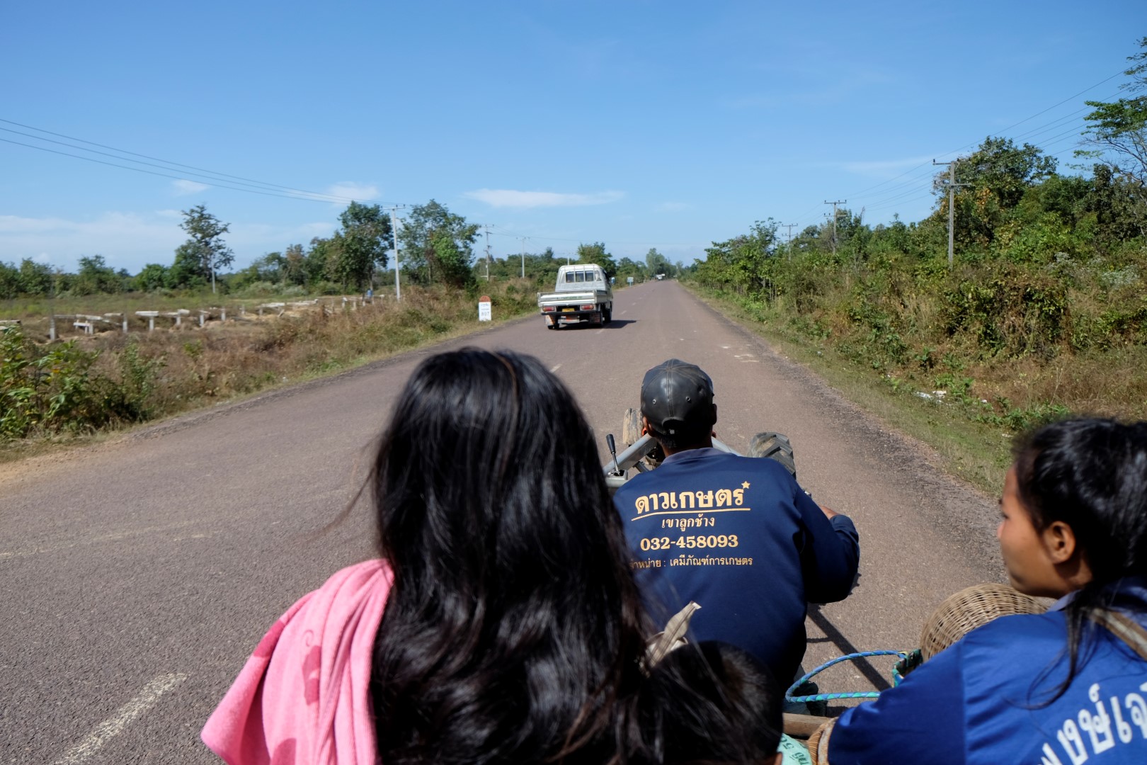 Novēlam riteņotājiem labu ceļavēju un paši soļojam lielā ceļa virzienā, esam nolēmuši pamēģināt ar stopiem tikt līdz pilsētai vārdā Pakse. Sapratuši, ka arī līdz šosejai ir krietns gabals, teju ar pirmo piegājienu noķeram pikapveidīgu auto, kas mūs žigli aizvizina līdz ceļam. Veiksmes iedvesmoti, stāvam ceļa malā un mēģinām noķert nākamo transportu. Tomēr vienīgais, ko pēc pārdesmit minūtēm varam sarunāt, ir traktors ar pāris vietējiem. Lai iet! Lecam kamanās un ripināmies uz priekšu. Tomēr ātrāk nekā iet kājām.