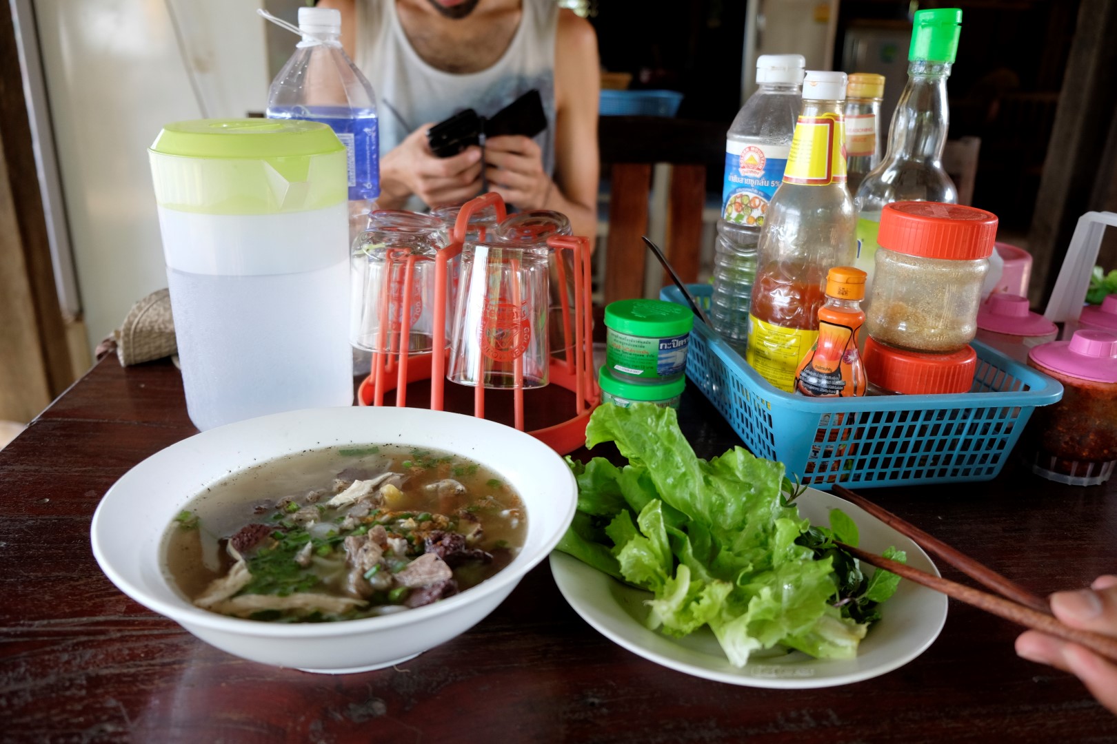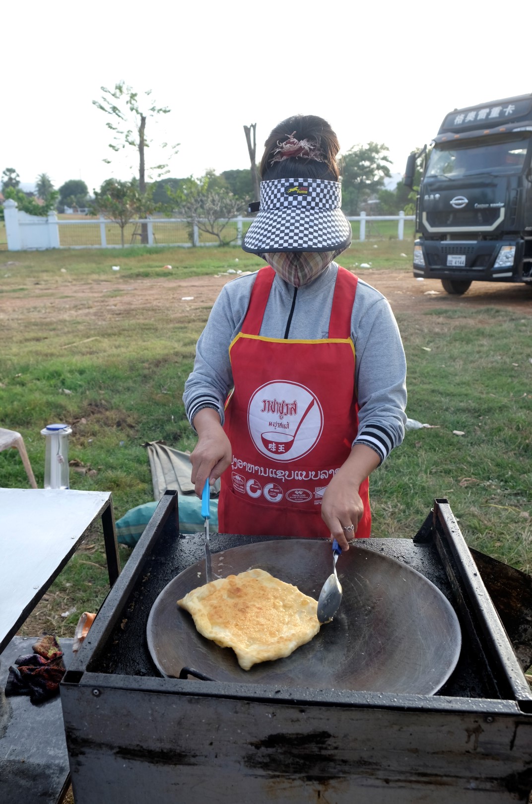 Arī nākamais transports, kas pietur, ir traktors. Traktoristi tomēr ir vieni feini ļaudis, vismaz Laosā. Kad tiekam ārā no šīs piekabes, dodamies meklēt ko ēdamu. Pasūtām viena dolāra zupiņu, kas man ar kolumbiešu Martinu iet pie sirds, bet argentīniešu Martins pukojas, lasīdams ārā no savas “no meat” porcijas gaļu un subproduktus, jo ir veģetārietis.