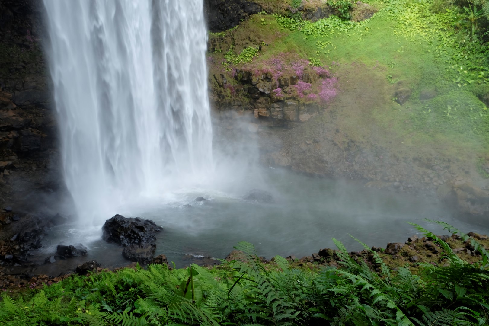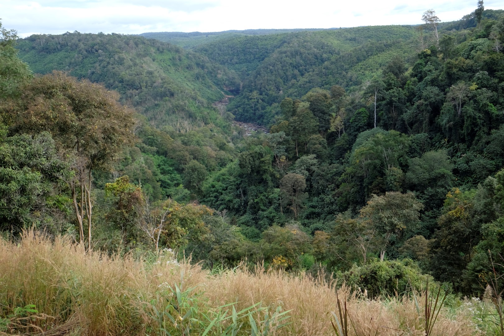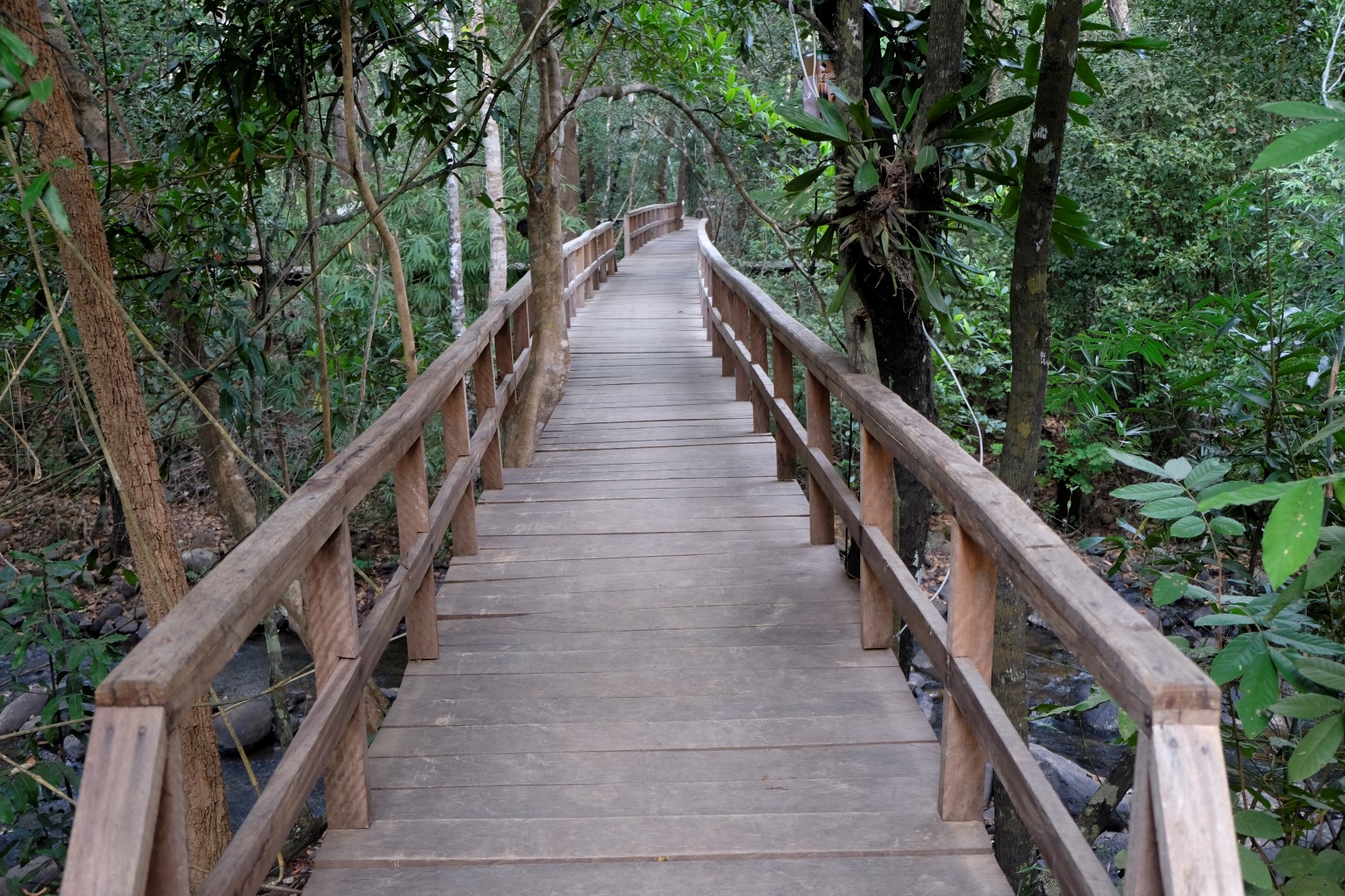 Stūrējam uz priekšu dzestrajā rītā – esam norunājuši iesākumā apskatīt pāris ūdenskritumus, tad meklēt brokastis. Ceļu uz pirmo ūdenskritumu nepamanām, piestājam pie nākamā, kas ir dažus kilometrus tālāk. Ūdenskrituma skaistums ir platumā, ne augstumā. Netālu iemitinājies kāds smalks resorts, kas izbūvējis koka takas džungļos, izmantojam iespēju un izstaigājam arī tās.