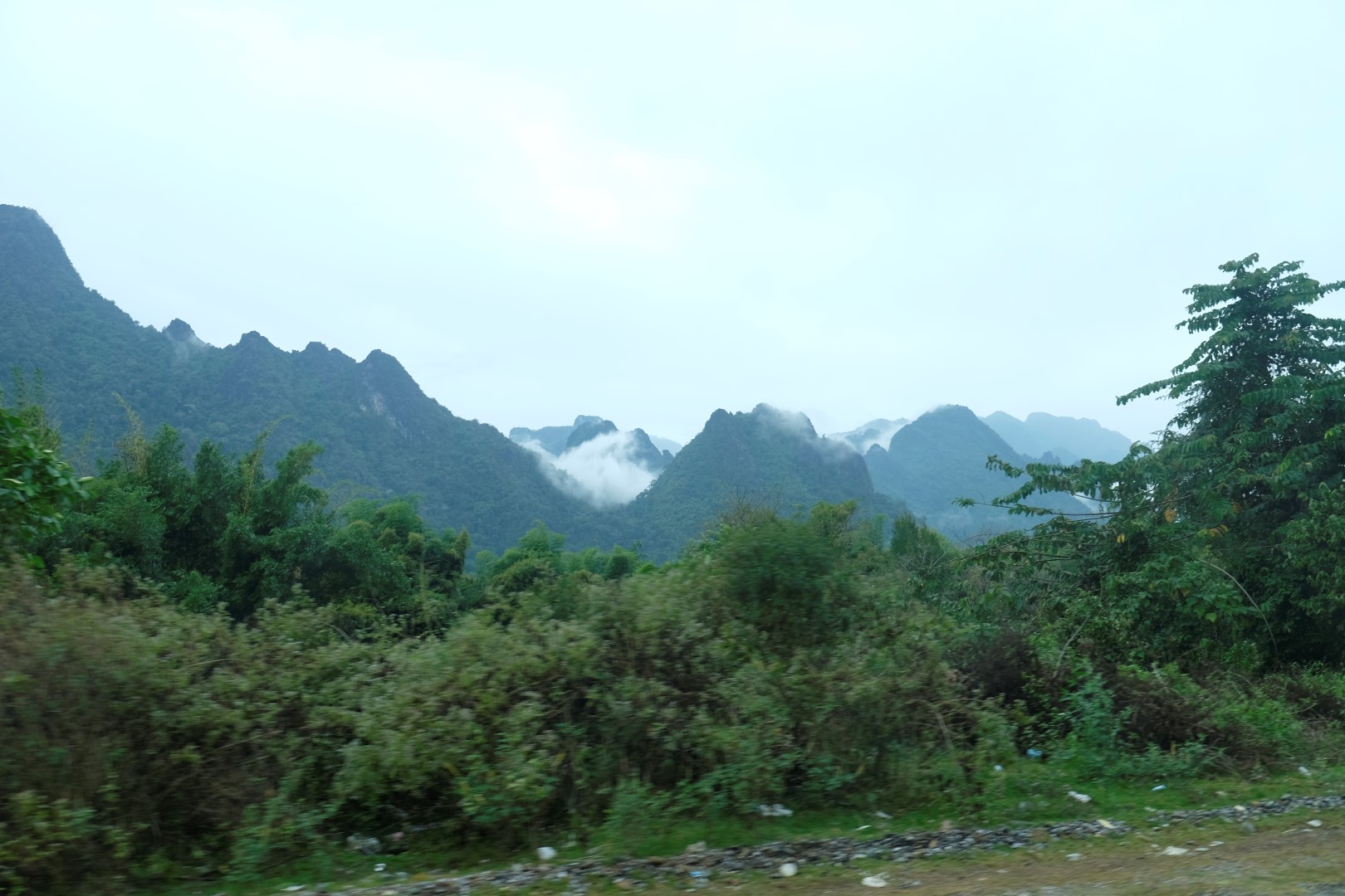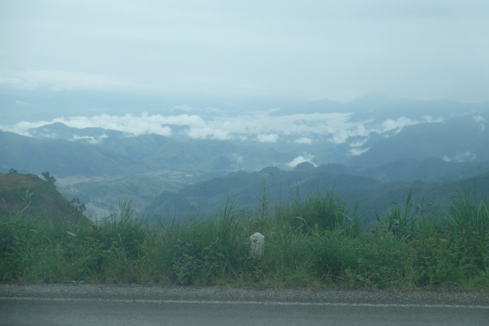 Jau pavisam drīz priecājamies par šo izvēli, jo lietus atsāk līņāt. Buss lēnītēm rāpjas kalnā, un apkārtējie skati priecē sirdi un acis. Ceļmalās zeļ augu stādi un sievas tirgo mandarīnu piramīdas, bet tālumā kalni spēlējas ar miglas vāliem. Kad tiekam pavisam augšā, migla ir pārņēmusi visu. Ik pa laikam baltā pasaule nedaudz piekāpjas, atklājot gabaliņu zaļās.