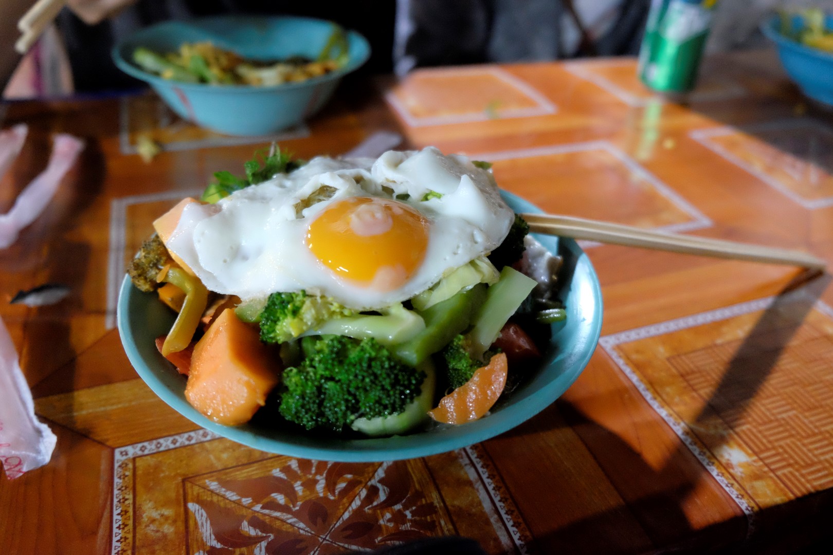 Pēc izstaigāšanās atkal vēders sāk atgādināt par sevi, tāpēc dodamies uz Betas ieteikto vietu tirgū, kur par 15 000 kipiem (2 USD) var ēst tik, cik saiet izsniegtajā bļodā. Atceros studentu laiku iemaņas – uzkrāmēt piramīdu pie Lido salātu stenda – un savietoju bļodā veģetārā ēdiena un olu konstrukciju. Garšo labi un porciju izdodas pieveikt ar nelielu piespiešanos.
