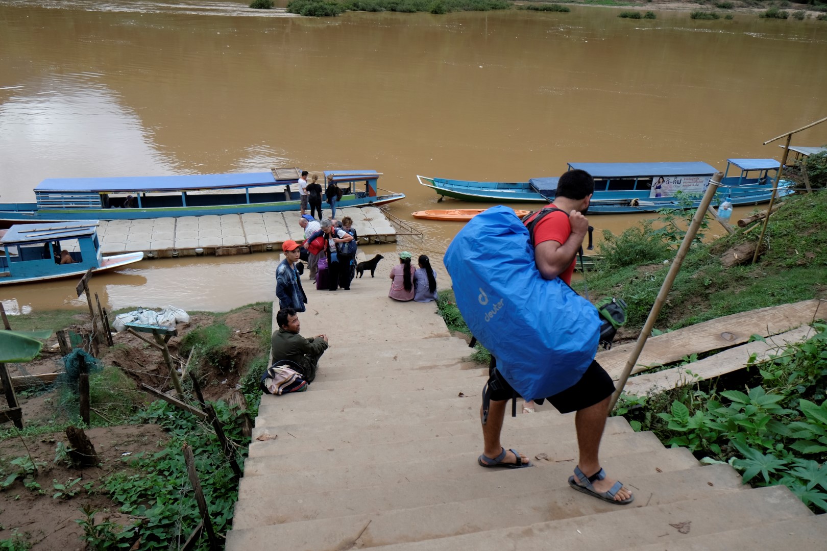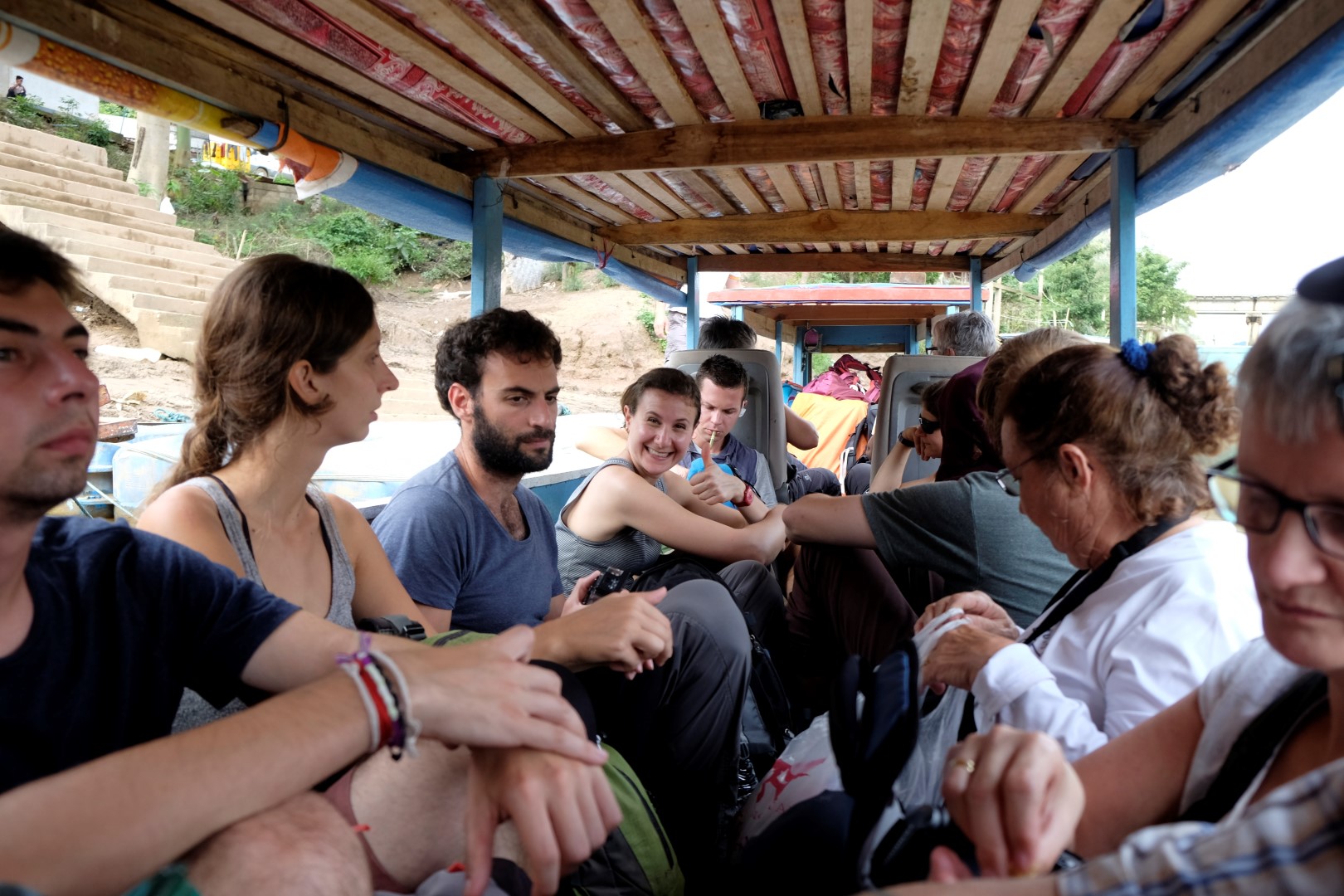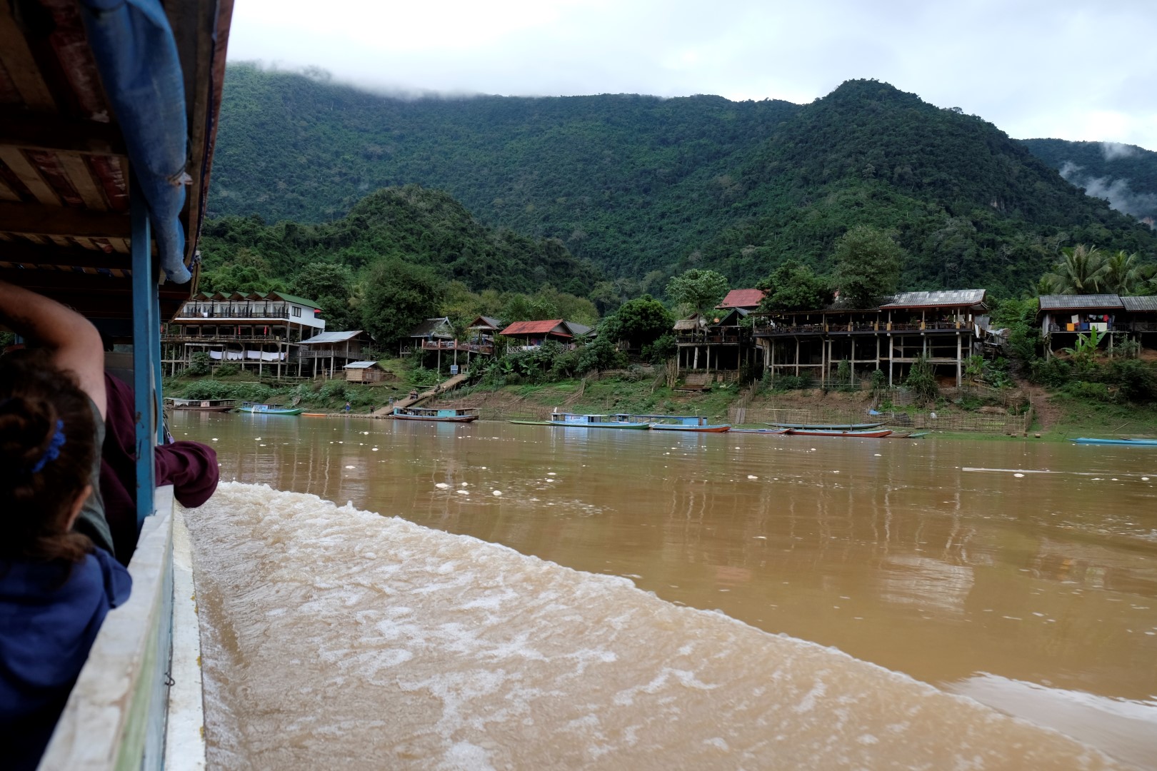 Lēnā garā aizčāpoju līdz laivu piestātnei, nākamais kuģis atiet pēc 40 minūtēm, tieši pietiek laiks, lai paēstu pusdienas. Esmu notiesājusi pusi cepto rīsu, kad ap stūri parādās Elizabete – meitene, ar kuru kopā braucām no Vjenčenas uz Vang Vieng. Šveiciete Elizabete nesen iepazinusies ar citu meiteni no Šveices, Sjūziju. Abas gan savā starpā sarunājas angliski, jo viena nāk no vācu valodā runājošās Šveices daļas, otra – no franciski runājošās daļas.