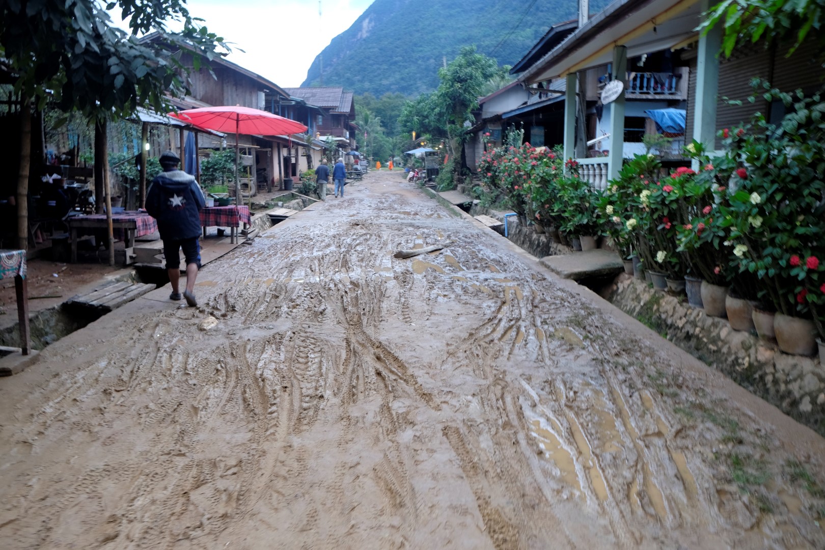 Vakariņas tuvojas izskaņai, kad ārā sāk līt. Kad esam paēdušas, lietus ir pārtapis pamatīgā gāzienā. Ko padarīsi – aizņemamies no kaimiņu galda Uno kārtis, pasūtām vēl vienu alu un ceram, ka lietus kādā brīdī pārstās līt. Kad šķiet, ka stiprāk līt vairs nav iespējams, lietus saņemas un parāda savu īsto spēku. Nu jau gar kafejnīcu ved nevis dubļains ceļš, bet gan brūna upe. Kāršu īpašnieki mums pēc brīža pievienojas, tomēr ir drusku par ilgu sēdējuši un spēle kļūst haotiska. Diviem francūžiem līdzi ir vietējais gids, ar kuru viņi ceļo jau trīs dienas. Gids mums uz galda no zobu bakstāmajiem liek dažādas figūras un uzdod atjautības uzdevumus – pārvietojot divus vai trīs posmus, jāsanāk citām figūrām. Kā nebūt esam sagaidījušas, kad lietus ir rimies, noraidām piedāvājumu pārcelties uz nākamo bāru un pa kārtīgiem dubļiem mērojam atpakaļceļu uz mūsu bungalo.
