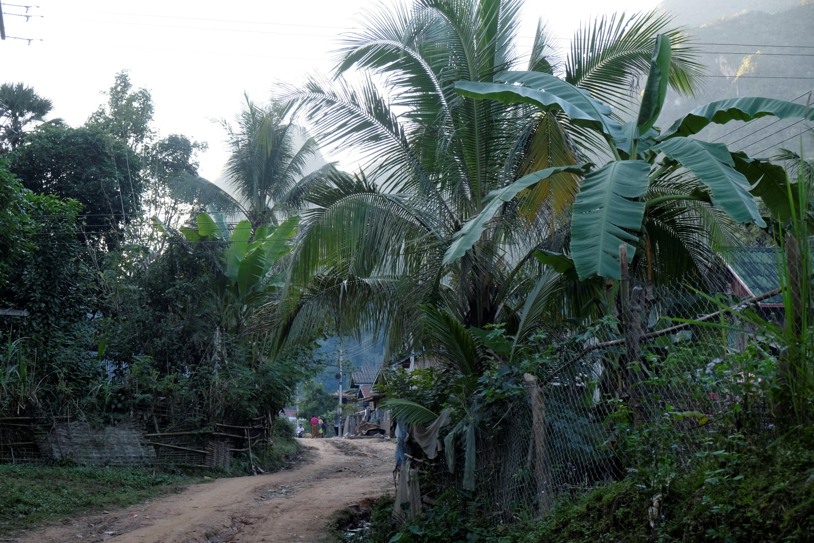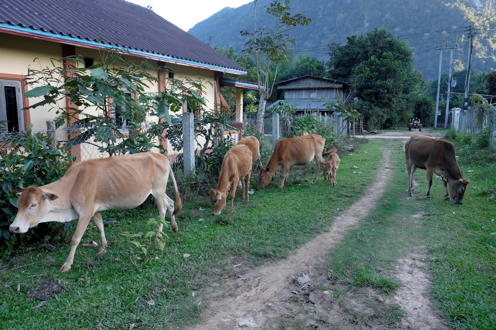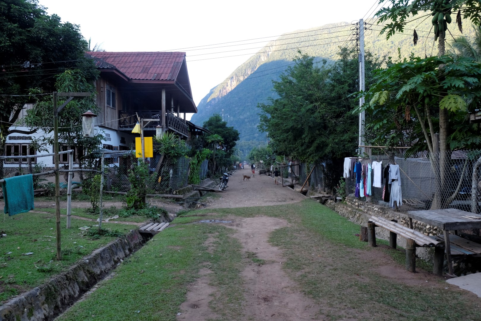 Lai visa diena nebūtu tikai datora sabiedrībā pavadīta, izeju atvadu pastaigā pa ciematu. Tas, protams, nav perfekts. Aiz centrālās ielas govis leksē iekšā atkritumus, vietējie neslēpti tecina lao lao ielas malā, kaķi un suņi ir tikpat izsalkuši kā citviet Āzijā. Tomēr šī ir mierīgākā vieta Laosā, kur iznācis līdz šim pabūt. Riktīgi žēl, ka mans lidojums ir jau pēc pāris dienām, gribētos šajā apvidū pavadīt vismaz vēl nedēļu – palikt pa nakti kādā no kalnu ciematiem, pabraukties augšup pa upi. Pati vainīga, nevajadzēja tik ilgi pārējās vietās sēdēt.