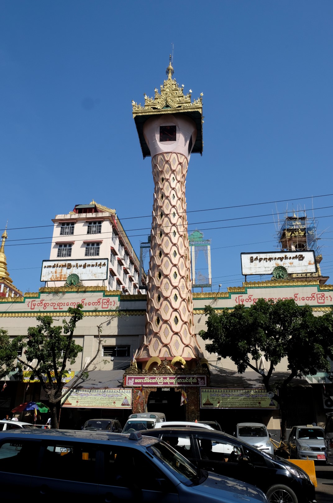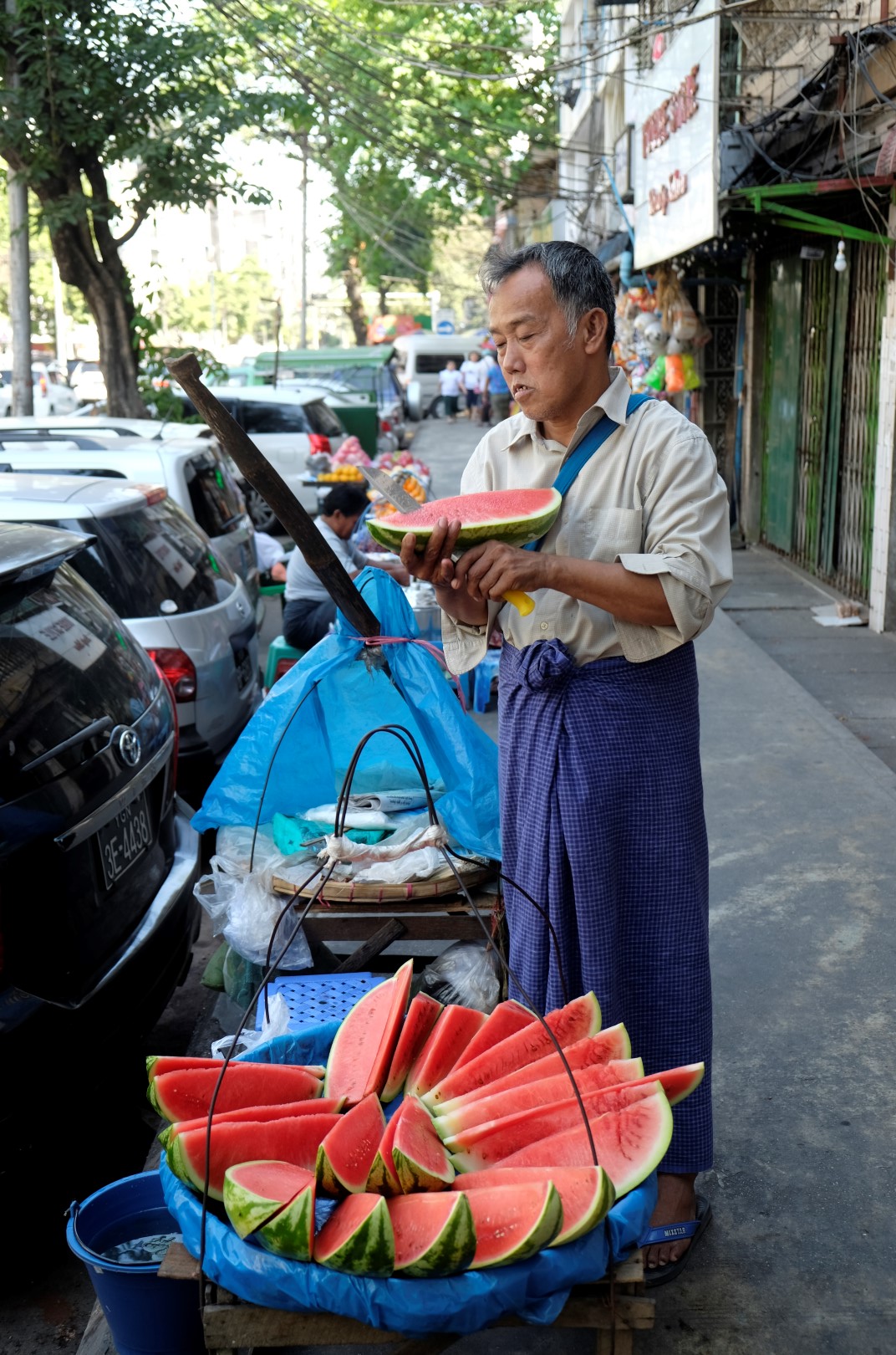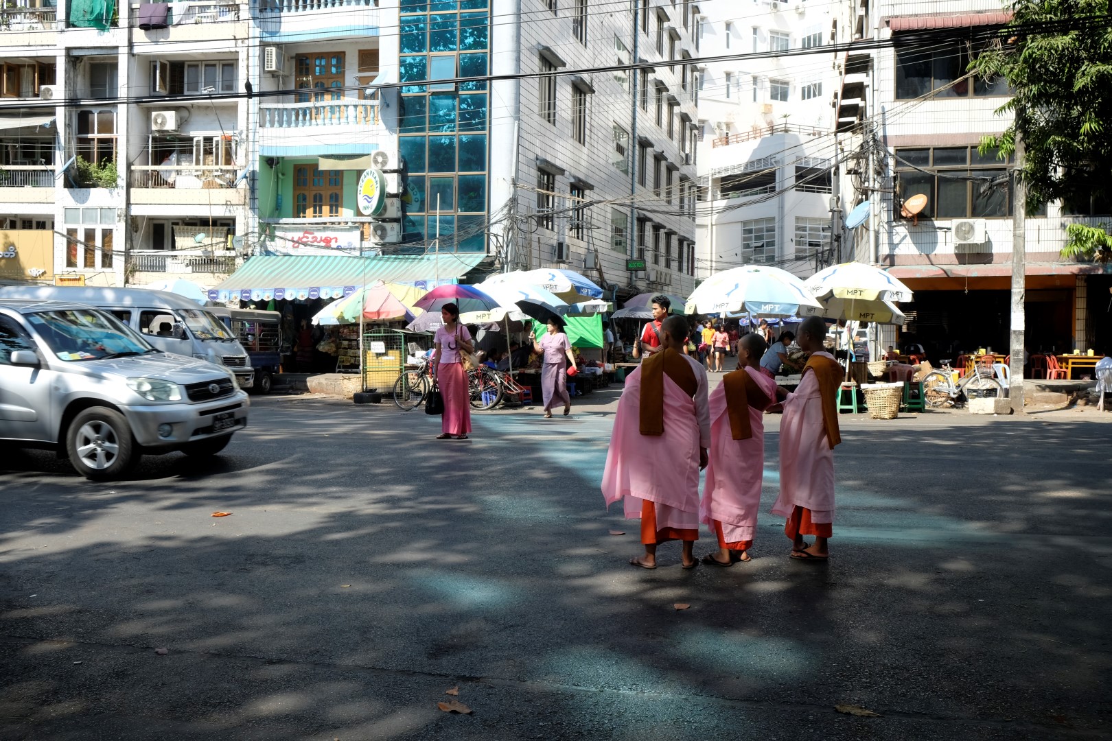 Kad vēders sāk vēstīt par pusdienlaika iestāšanos, piesēžu vienā no daudzajām šejienes ielas ēstuvēm. Palūdzu gaļu un rīsus. Tos man atnes komplektā ar dīvaina paskata zupiņu un zaļumiem. Zupa garšo diezgan labi, nedaudz atgādina mūsu skābeņu virumu. Kad esmu to izēdusi, meitene uzpilda vēl, pirms esmu paspējusi ko iebilst. Maltītes vidū manā priekšā nostājas trīs rozā mūciņi un pastiepj ziedojumu trauku. Lai nesabojātu karmu jau pirmajā dienā, iemetu nelielu banknoti un viņi apmierināti dodas prom. Pēc tam attopos, ka vajadzēja iemest 3 ar pusi dolārus – naudu, ko svešinieks vakar man veltīja. Nekas, pilna pilsēta mūkiem, gan paspēšu. Šeit nekur nemana citviet ierasto oranžo mūku ietērpu, mazie mūki un sievietes tērpjas rozā, bet gados vecāki vīri – tumši sarkanā ietērpā.