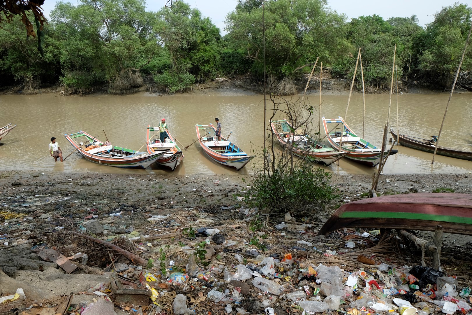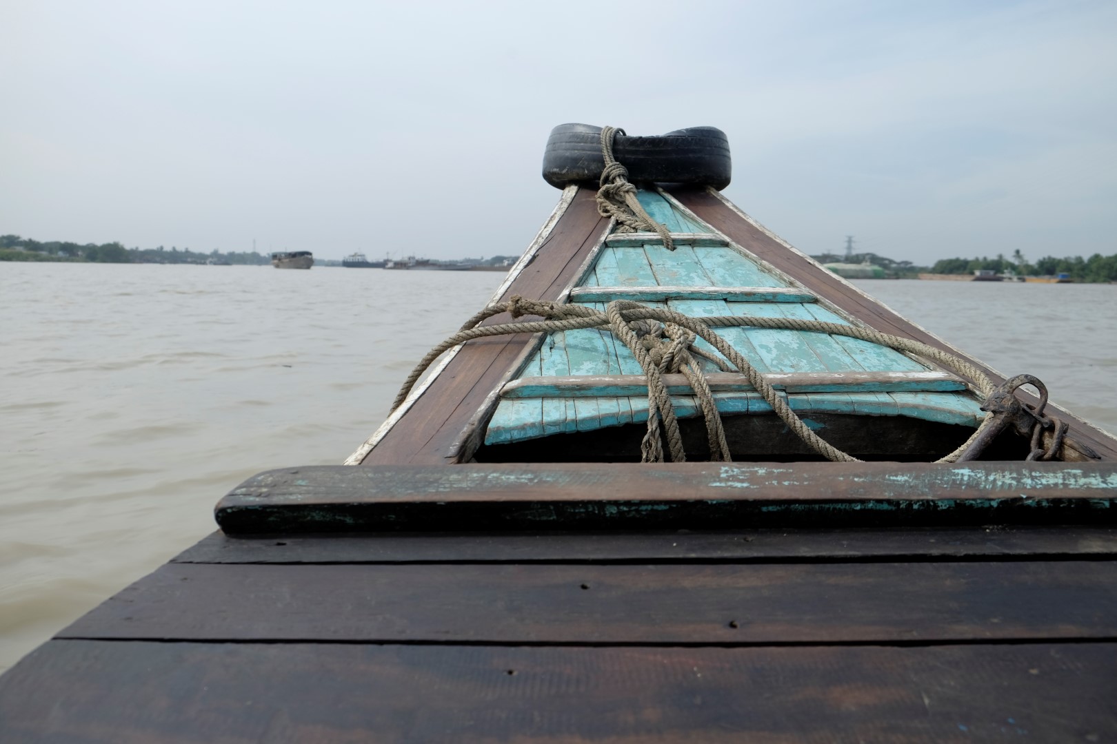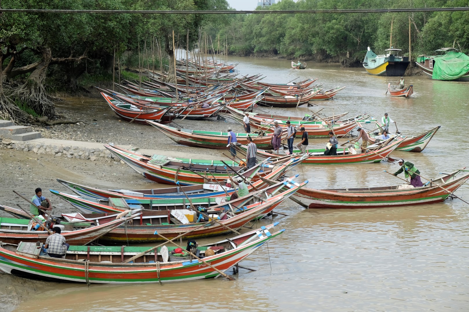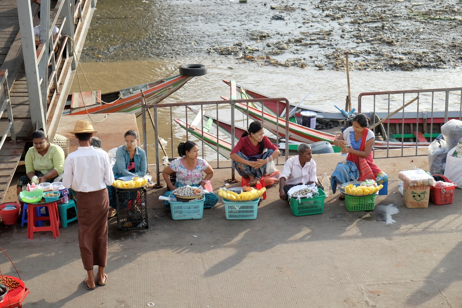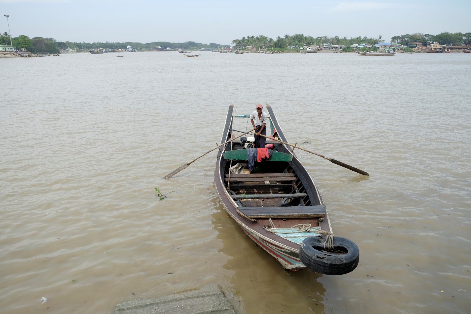 Iestūrējam ostā, nopērku prāmja biļeti, par kuru šķiros no 2000 (pusotra eiro), vietējie gan maksā vien 100 naudiņas. Pārvietoties ar privātām laivām tūristiem esot aizliegts, tāpat arī nakšņot šaipus upei. Tā kā Maungmaungs pats par naudu nerunā, iedodu piecreiz vairāk nekā esam vienojušies – 10 000, tādējādi nokārtojot karmas attiecības ar izpalīdzīgo svešinieku Bangkokas lidostā. Kalsnais burmietis apgalvo, ka nekad mani neaizmirsīšot. Pieņemu, ka tāpēc, ka ne jau katru dienu ārzemnieces šo izvizina.