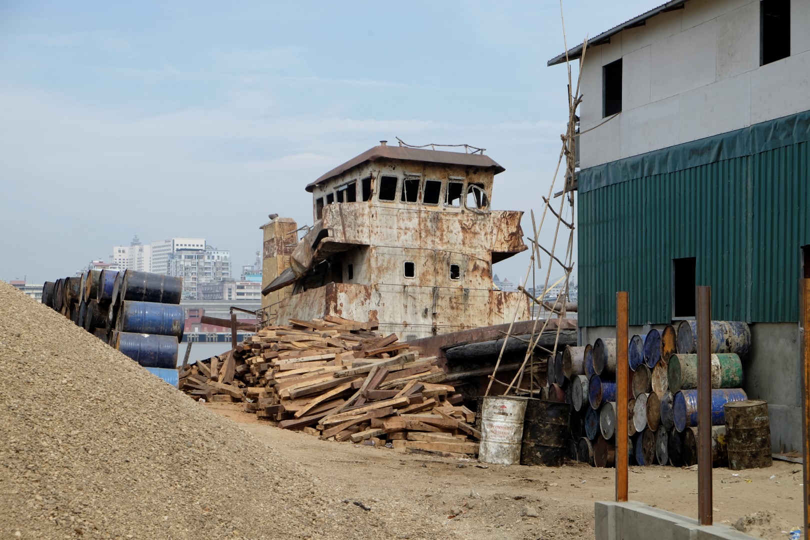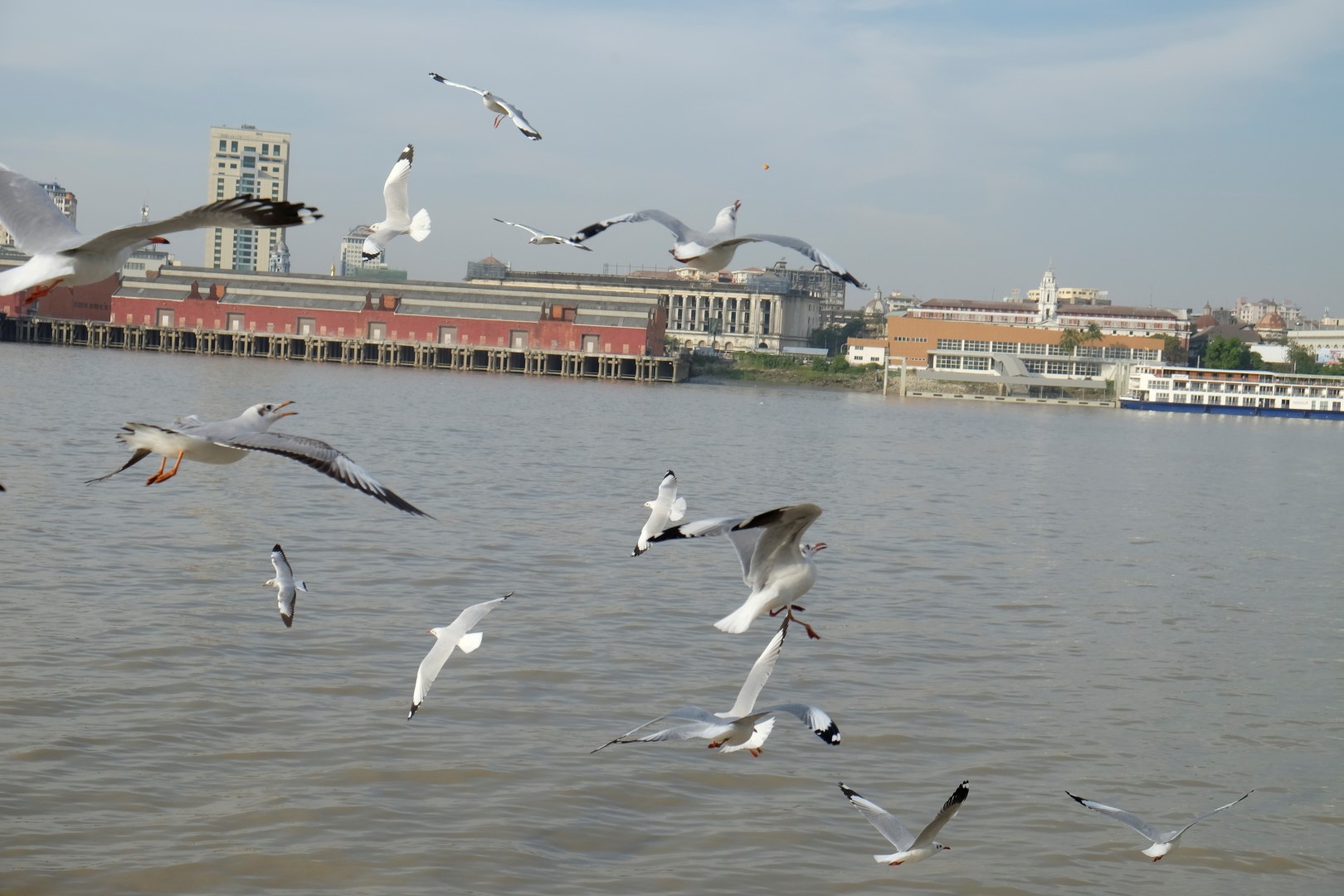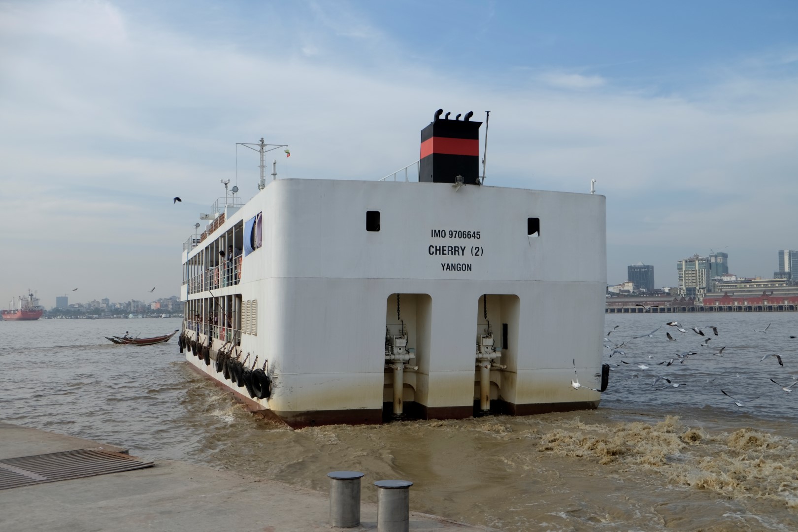 Sākumā ar vietējo autobusu aizbraucam līdz vienai no laivu piestātnēm. Autobusi šobrīd kursē bez maksas, jo pirms dažām dienām Jangonā ieviesta jauna transporta sistēma un ļaudīm tiek dots laiks pierast pie tās. Gan autobusos, gan pieturās stāv speciālos kreklos tērpti brīvprātīgie, kas palīdz orientēties jaunajā kārtībā.