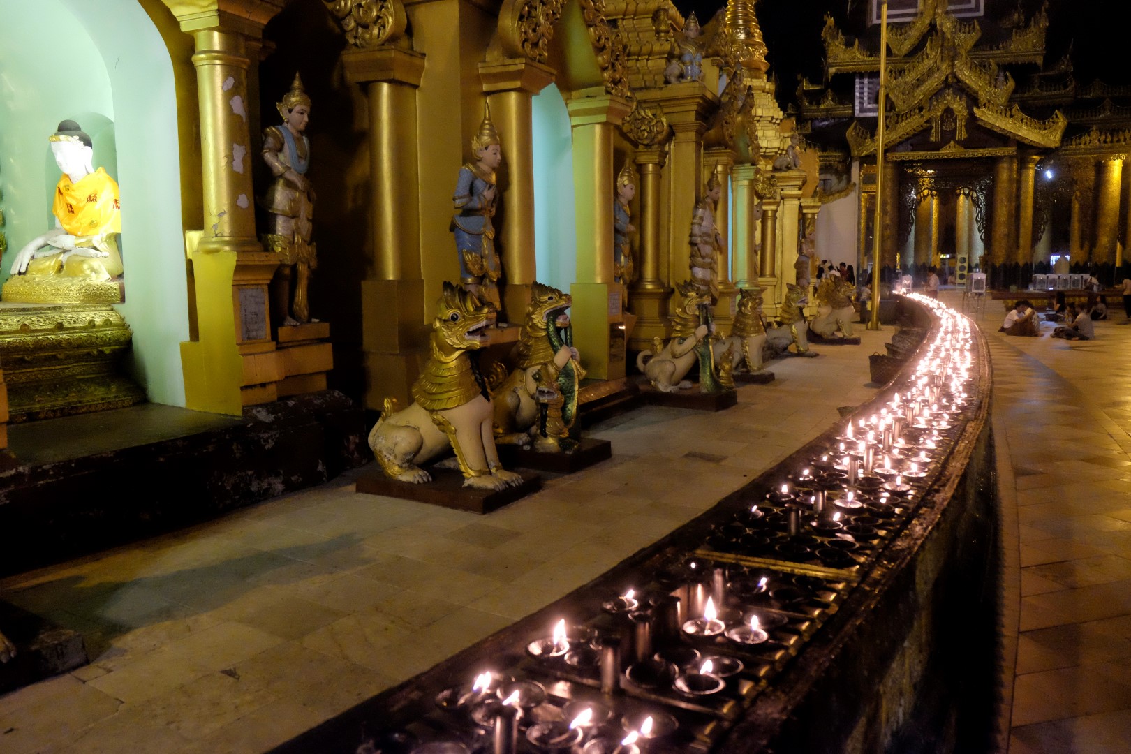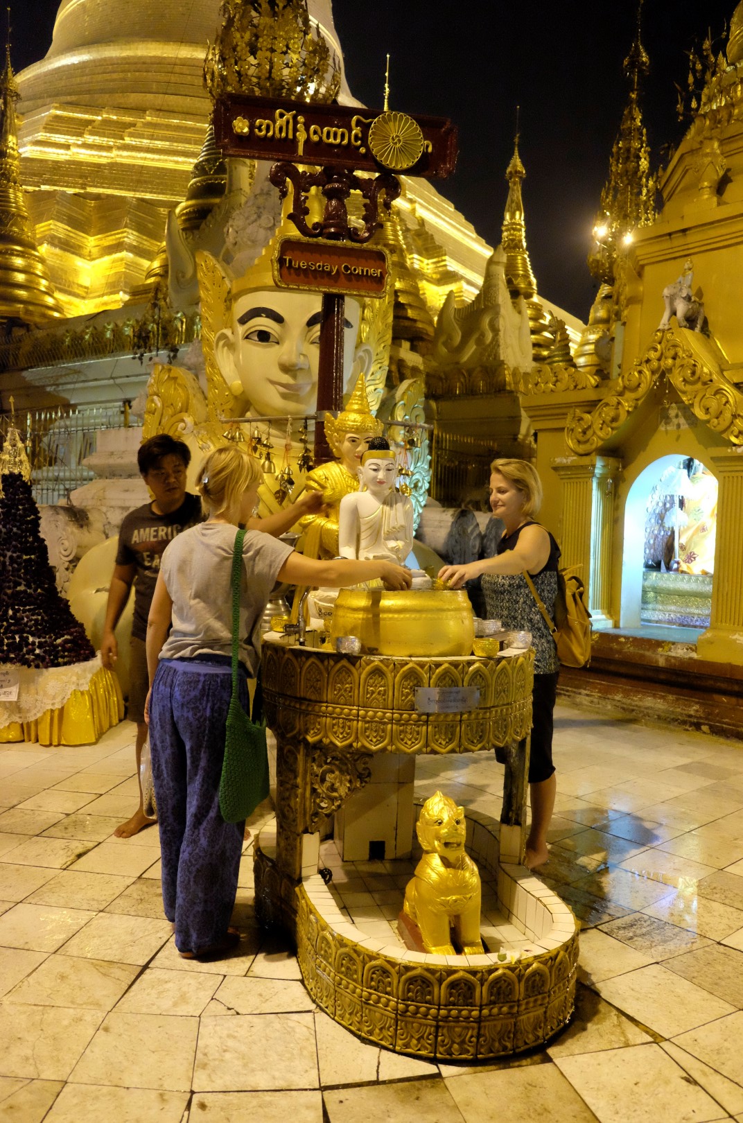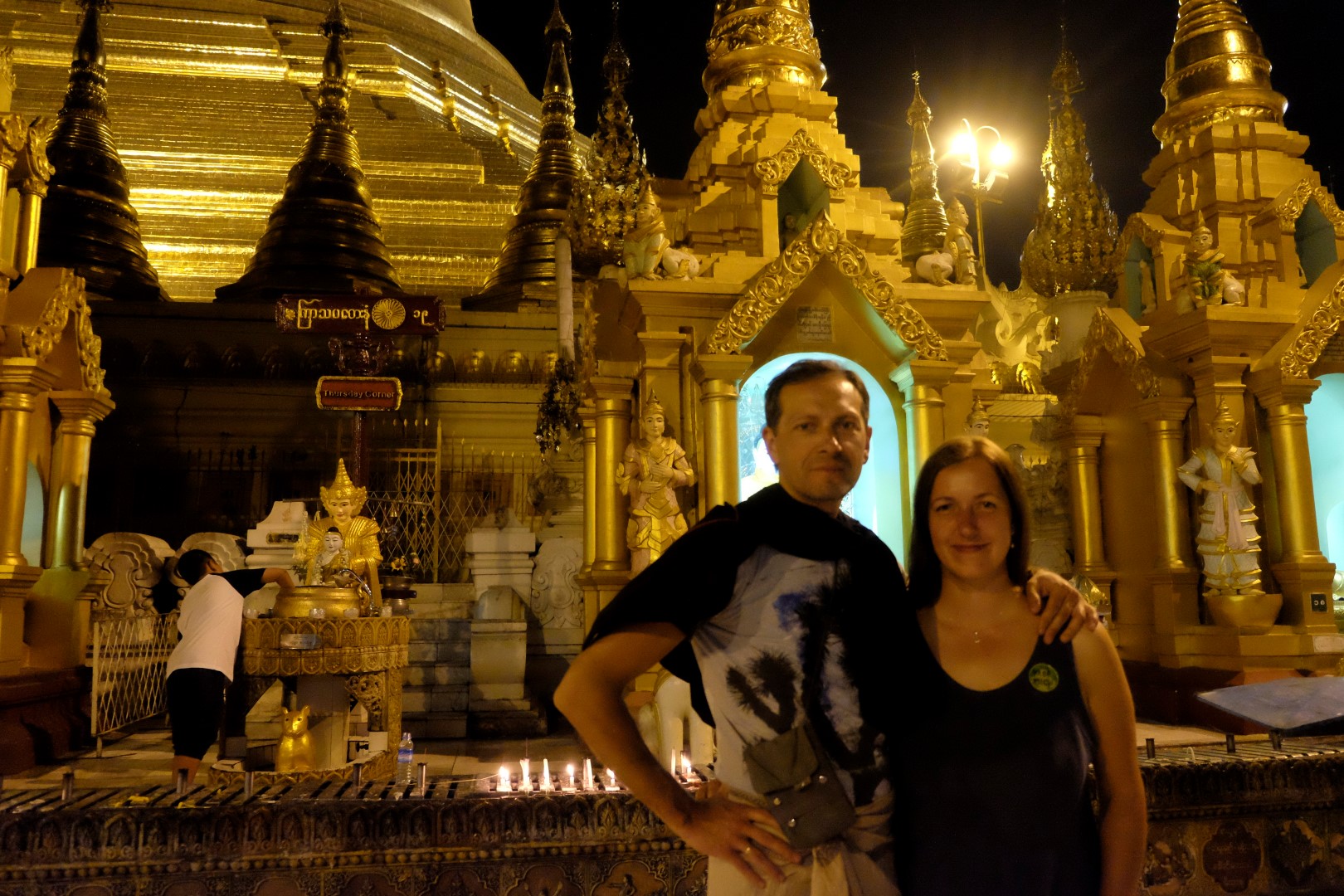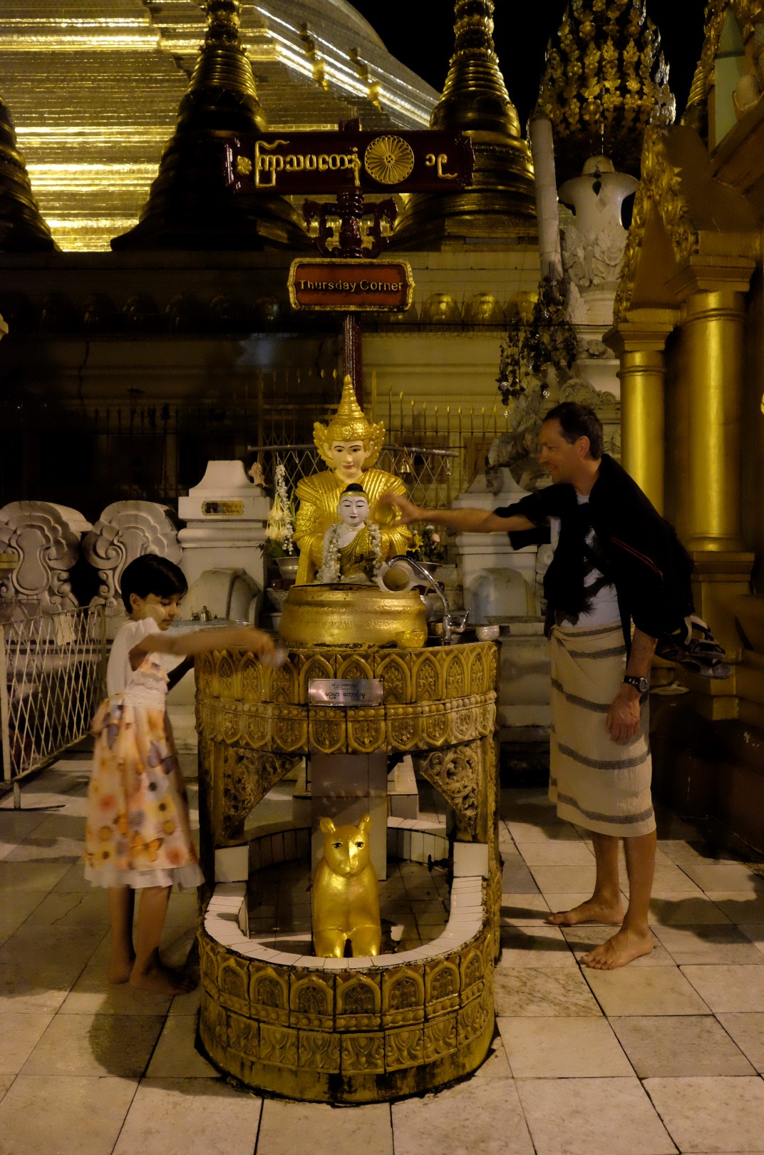 Paēduši un saskandinājuši vienu alu, dodamies aplūkot slaveno Švedagonas pagodu, kas būvēta pirms vismaz 2500 gadiem. Pagodu klāj simtiem zelta plāksnīšu, tā rotāta ar 4531 dimantiem un šeit glabājoties arī īstie Budas mati, astoņi gabali. Apkārt centrālajai pagodai sabūvētas mazākas celtnes zelta krāsā, katrā stūrī sēž vai guļ kāds Buda. Par spīti vēlajam vakaram, šeit ir ļaužu pilns, daudzi skandē mantras un lūdzas, bērni spēlējas, lielie skatās telefonos un pastaigājas. Ejot pa apli, var sastapt katras nedēļas dienas “stūrīti”, kur attiecīgā dienā dzimušie, lejot Budam un dienai atbilstošajam dzīvniekam uz galvas ūdeni, var tikt pie likteņa labvēlības (šī ir mana interpretācija par gūto labumu). Jālaista esot tik reizes, cik pašam gadu. Katrs aplaistām savu stūrīti un zvēruli. Brīdī, kad Andžejs laista žurciņas statueti, garām paskrien arī dzīvā versija. “Nez, vai tai arī jālej virsū?”, Andžejs retoriski noprasa.