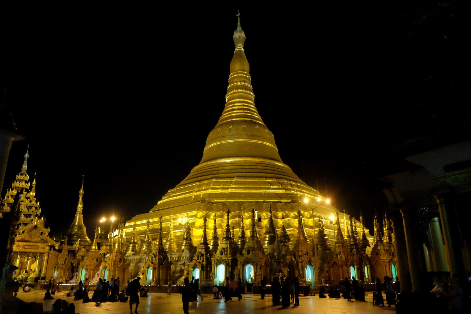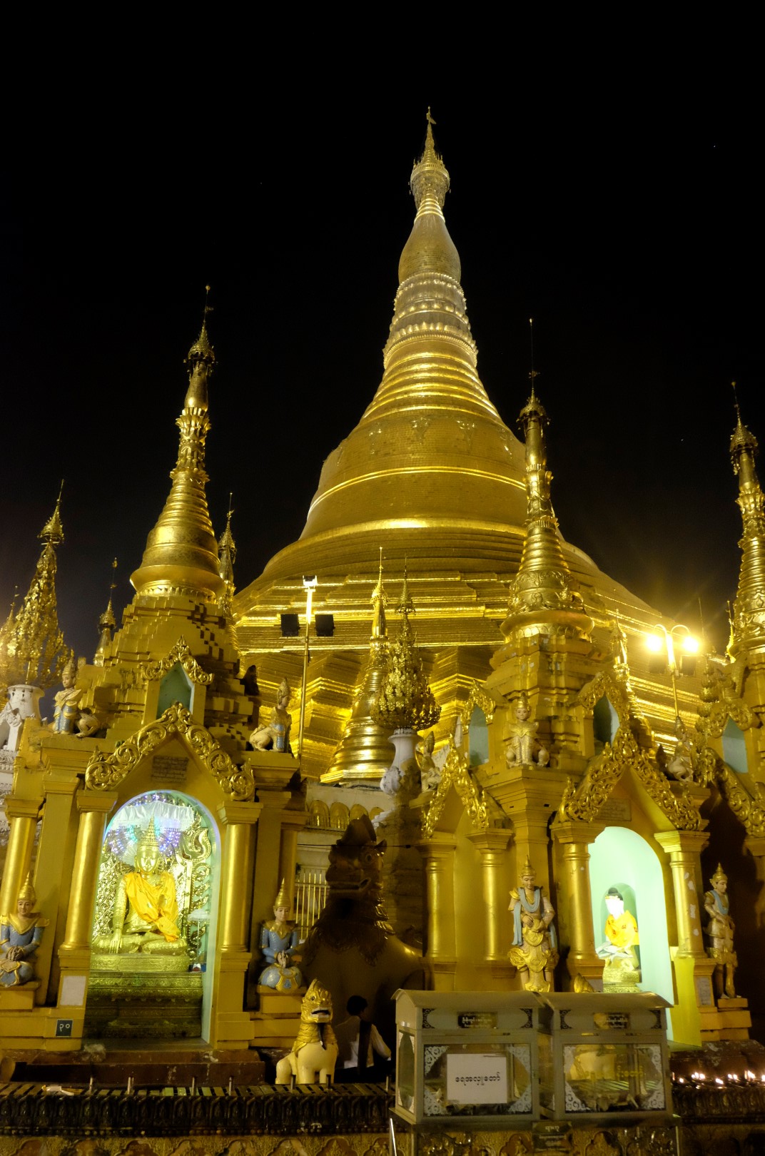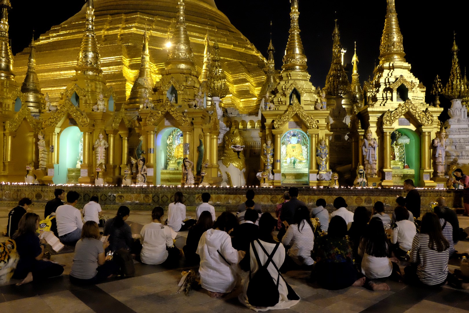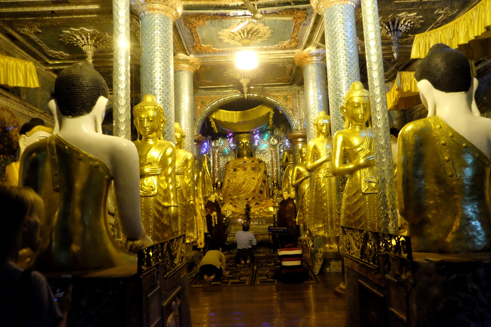 Paēduši un saskandinājuši vienu alu, dodamies aplūkot slaveno Švedagonas pagodu, kas būvēta pirms vismaz 2500 gadiem. Pagodu klāj simtiem zelta plāksnīšu, tā rotāta ar 4531 dimantiem un šeit glabājoties arī īstie Budas mati, astoņi gabali. Apkārt centrālajai pagodai sabūvētas mazākas celtnes zelta krāsā, katrā stūrī sēž vai guļ kāds Buda. Par spīti vēlajam vakaram, šeit ir ļaužu pilns, daudzi skandē mantras un lūdzas, bērni spēlējas, lielie skatās telefonos un pastaigājas. Ejot pa apli, var sastapt katras nedēļas dienas “stūrīti”, kur attiecīgā dienā dzimušie, lejot Budam un dienai atbilstošajam dzīvniekam uz galvas ūdeni, var tikt pie likteņa labvēlības (šī ir mana interpretācija par gūto labumu). Jālaista esot tik reizes, cik pašam gadu. Katrs aplaistām savu stūrīti un zvēruli. Brīdī, kad Andžejs laista žurciņas statueti, garām paskrien arī dzīvā versija. “Nez, vai tai arī jālej virsū?”, Andžejs retoriski noprasa.