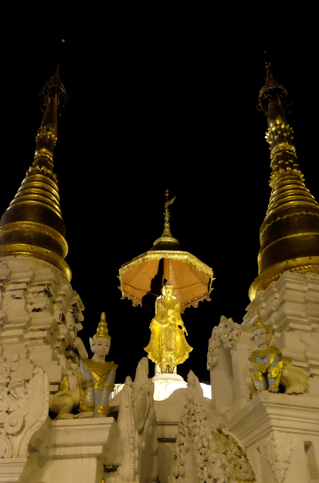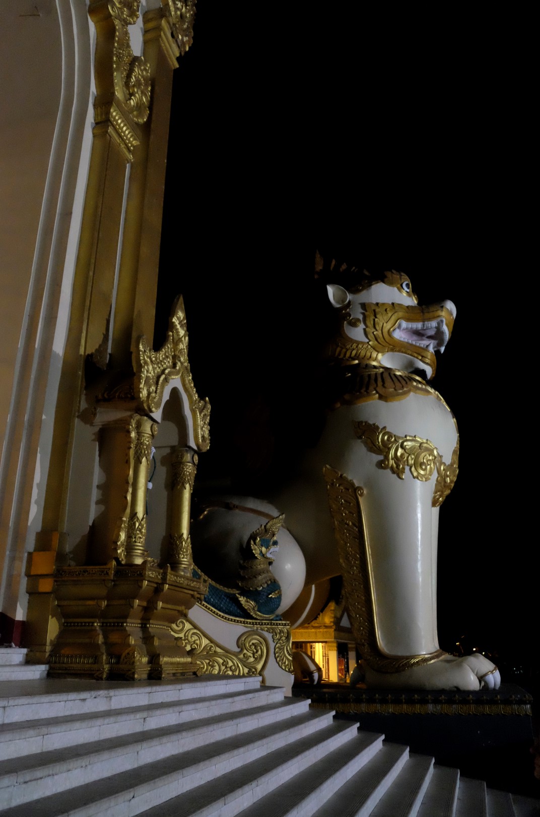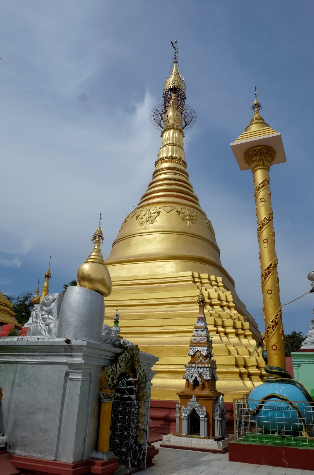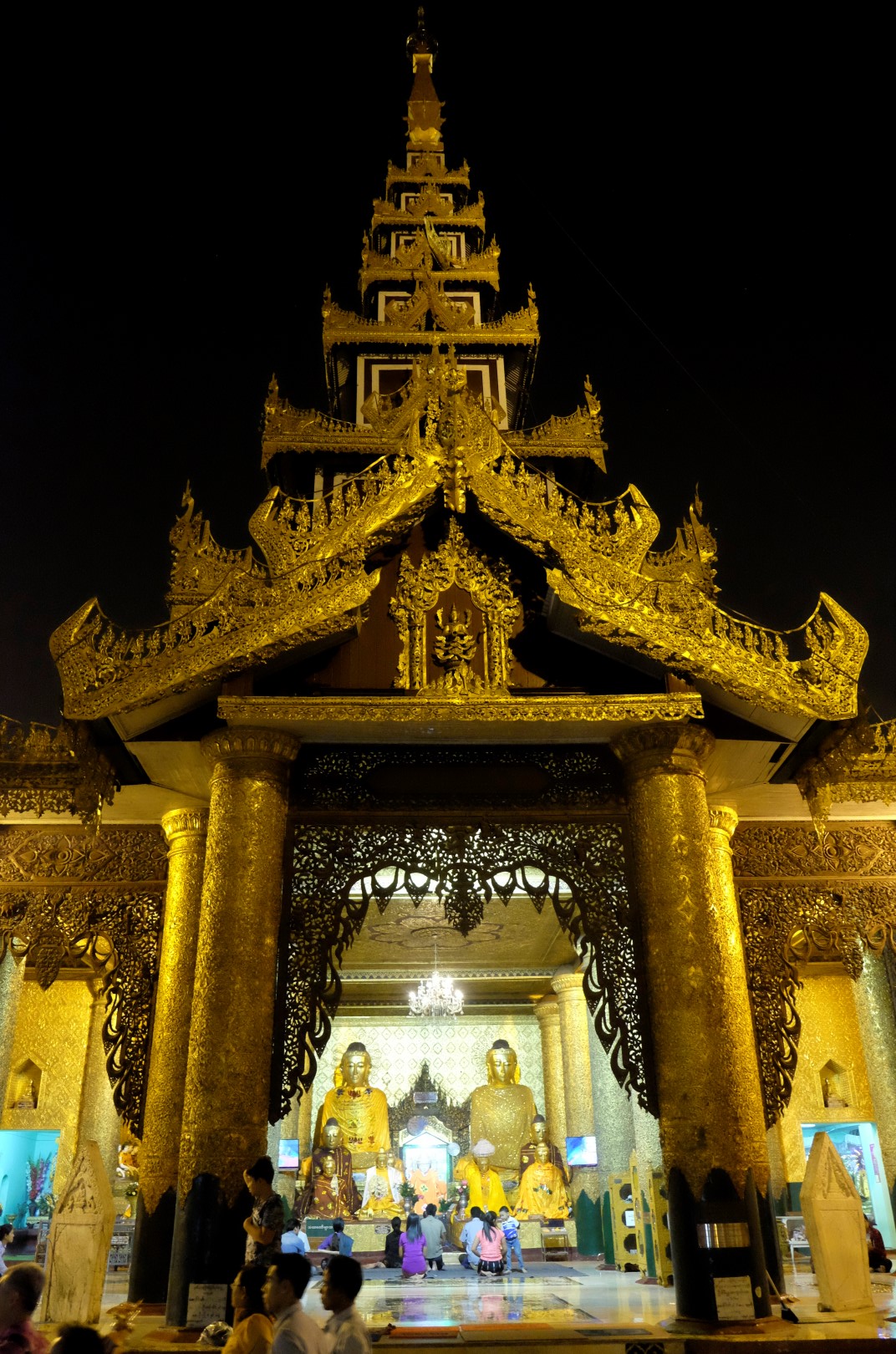 Paēduši un saskandinājuši vienu alu, dodamies aplūkot slaveno Švedagonas pagodu, kas būvēta pirms vismaz 2500 gadiem. Pagodu klāj simtiem zelta plāksnīšu, tā rotāta ar 4531 dimantiem un šeit glabājoties arī īstie Budas mati, astoņi gabali. Apkārt centrālajai pagodai sabūvētas mazākas celtnes zelta krāsā, katrā stūrī sēž vai guļ kāds Buda. Par spīti vēlajam vakaram, šeit ir ļaužu pilns, daudzi skandē mantras un lūdzas, bērni spēlējas, lielie skatās telefonos un pastaigājas. Ejot pa apli, var sastapt katras nedēļas dienas “stūrīti”, kur attiecīgā dienā dzimušie, lejot Budam un dienai atbilstošajam dzīvniekam uz galvas ūdeni, var tikt pie likteņa labvēlības (šī ir mana interpretācija par gūto labumu). Jālaista esot tik reizes, cik pašam gadu. Katrs aplaistām savu stūrīti un zvēruli. Brīdī, kad Andžejs laista žurciņas statueti, garām paskrien arī dzīvā versija. “Nez, vai tai arī jālej virsū?”, Andžejs retoriski noprasa.