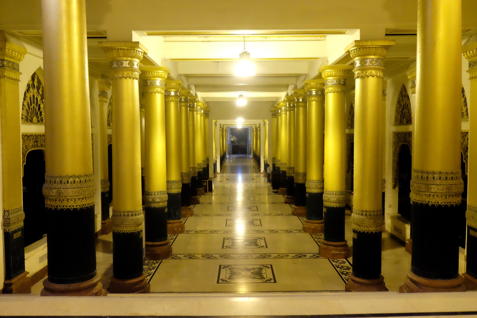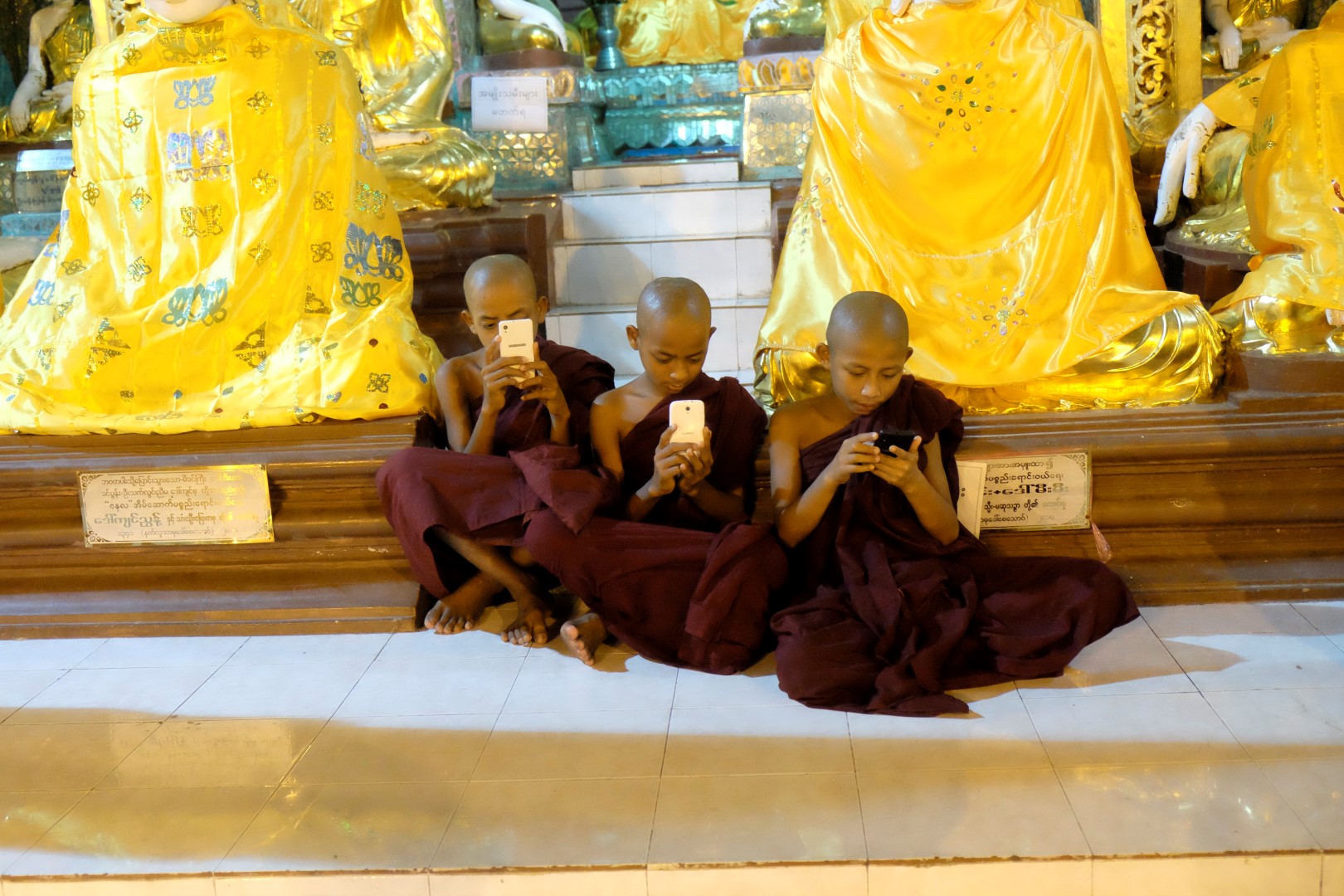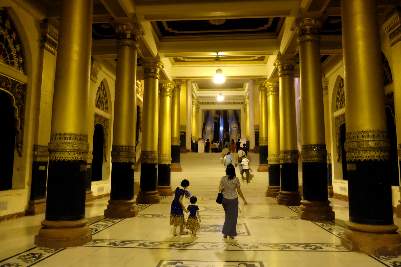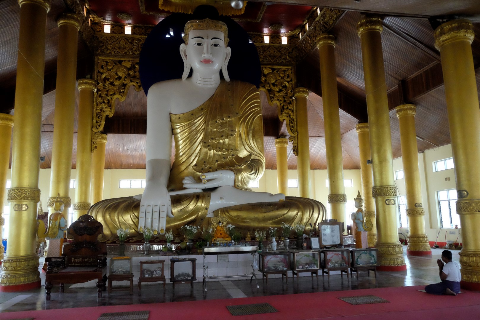 Paēduši un saskandinājuši vienu alu, dodamies aplūkot slaveno Švedagonas pagodu, kas būvēta pirms vismaz 2500 gadiem. Pagodu klāj simtiem zelta plāksnīšu, tā rotāta ar 4531 dimantiem un šeit glabājoties arī īstie Budas mati, astoņi gabali. Apkārt centrālajai pagodai sabūvētas mazākas celtnes zelta krāsā, katrā stūrī sēž vai guļ kāds Buda. Par spīti vēlajam vakaram, šeit ir ļaužu pilns, daudzi skandē mantras un lūdzas, bērni spēlējas, lielie skatās telefonos un pastaigājas. Ejot pa apli, var sastapt katras nedēļas dienas “stūrīti”, kur attiecīgā dienā dzimušie, lejot Budam un dienai atbilstošajam dzīvniekam uz galvas ūdeni, var tikt pie likteņa labvēlības (šī ir mana interpretācija par gūto labumu). Jālaista esot tik reizes, cik pašam gadu. Katrs aplaistām savu stūrīti un zvēruli. Brīdī, kad Andžejs laista žurciņas statueti, garām paskrien arī dzīvā versija. “Nez, vai tai arī jālej virsū?”, Andžejs retoriski noprasa.