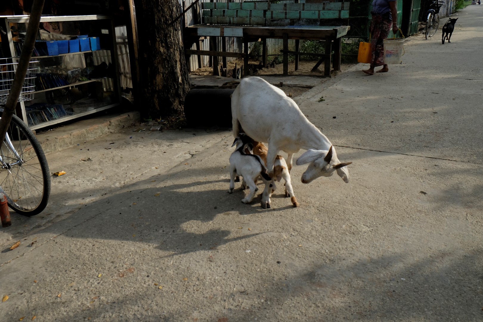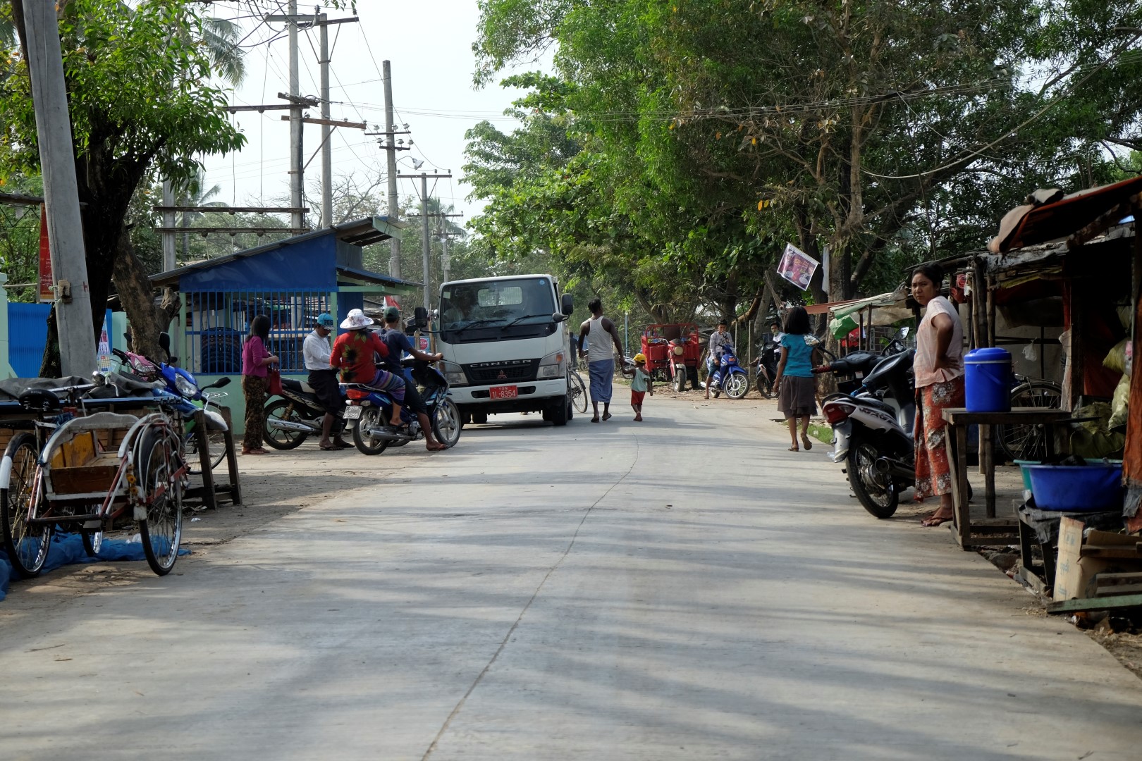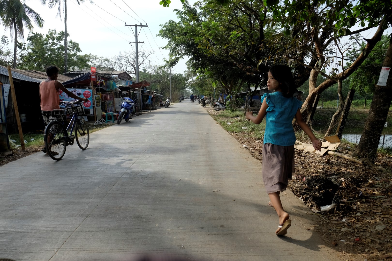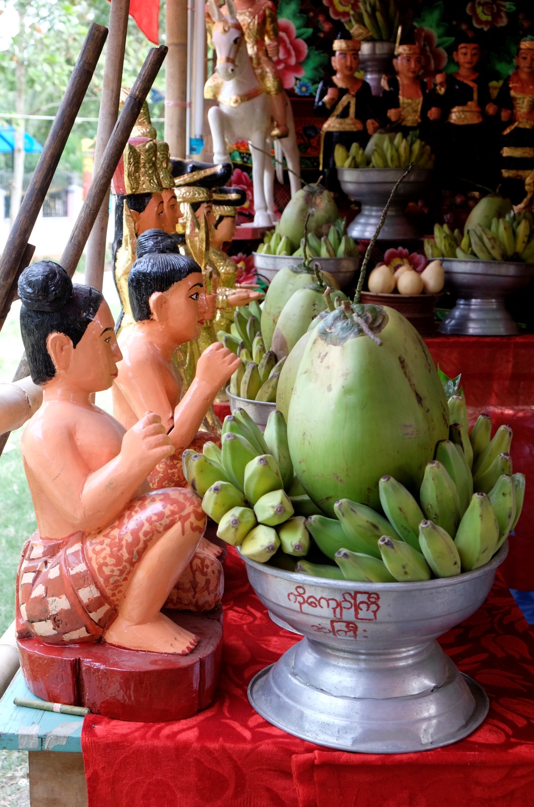 Fū, bez viņa jūtos krietni brīvāk. Kopumā priecājos atrasties šeit, pavisam citā pasaulē nekā pilsētā. Nonākusi prāmju piestātnē, nolemju vēl aizstaigāt līdz vienam šejienes templim, tad kuģot atpakaļ uz Jangonu. Noraidu vairākus velorikšu piedāvājumus, bet viens no braucējiem turpina sekot un runāties. Saku viņam, ka man jau šodienai pavadoņu pietiek, apskatīšu templi un viss. Tomēr pēc brīža joka pēc jautāju, cik maksātu pilna ekskursija pa apkaimi – 4000. Tik esot jāsamaksā par šīs rikšas īri vienai dienai, viņa braucamais no rīta esot salūzis un atrodas darbnīcā. Nezinu, bet kaut kas rikšas vadītāja teiktajā manī raisa uzticību un, kad viņš piekrīt par 2000 veikt īso ekskursijas versiju, “sēžos kamanās”.