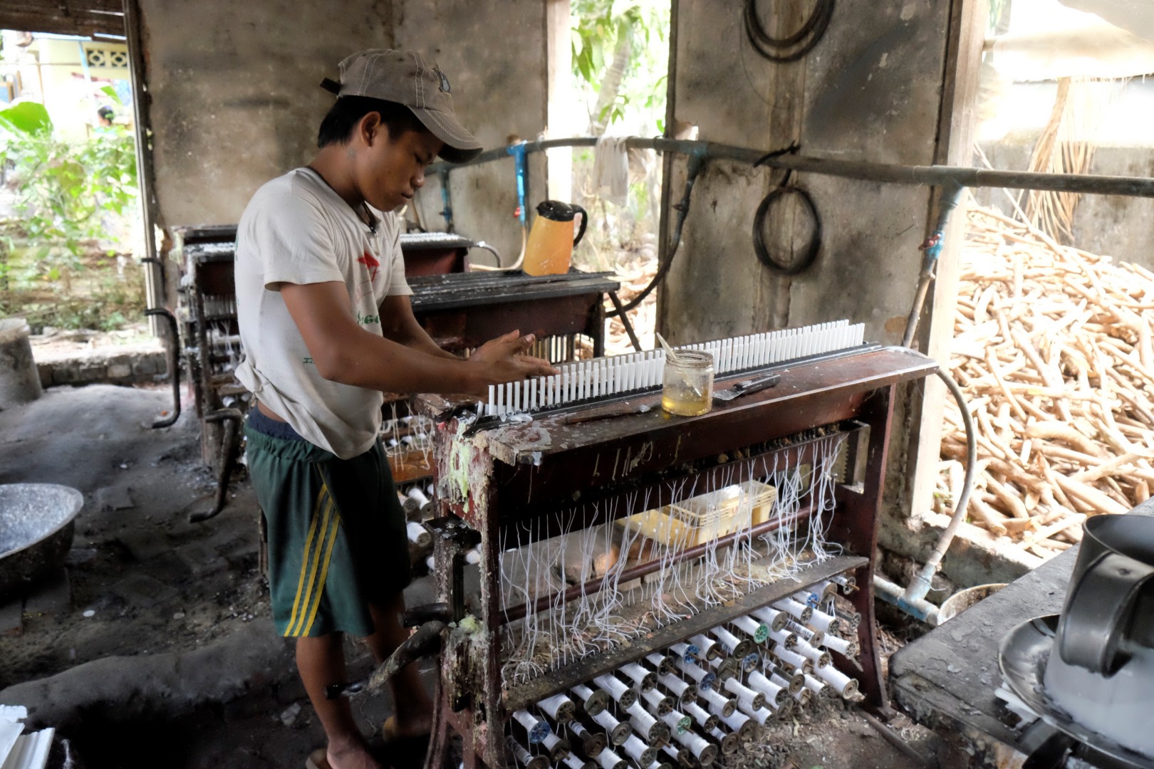 Maungmaungs mani aizved uz sveču darbnīcu un pankūku ceptuvi. Apbrīnojami – kādā tempā un tehnikā darbojas cepēji, šeit neliels ieskats.