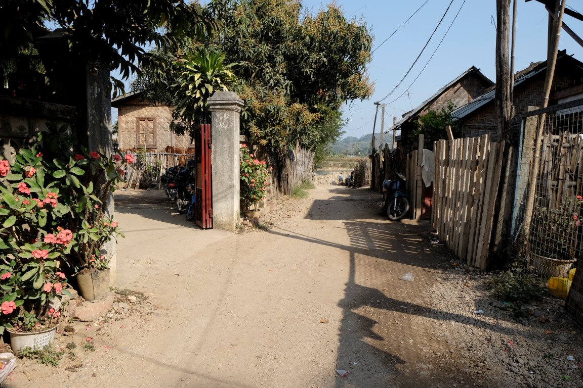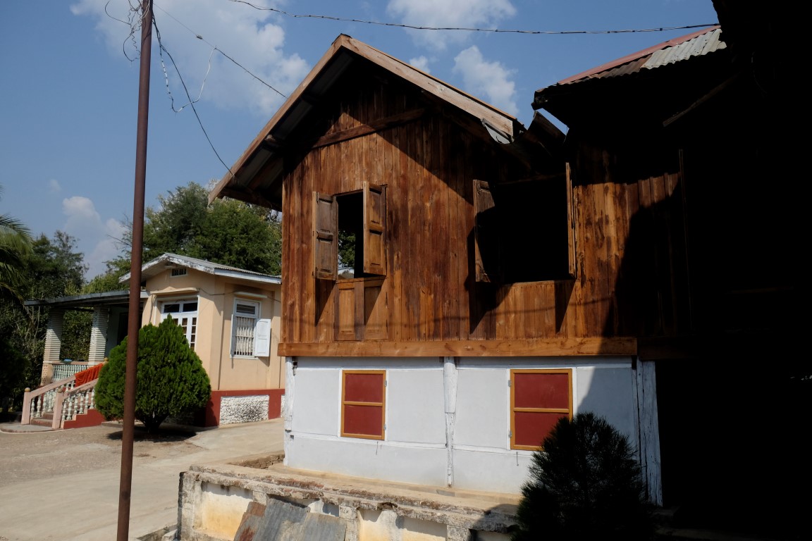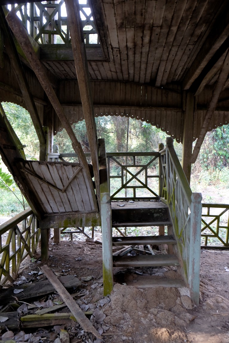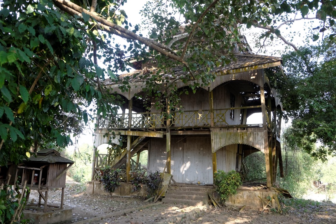 Pulksten trijos uz divām stundām veras vaļā objekts, kas kartē atzīmēts kā Hsipaw pils. Tas gan ir mazliet pārspīlēts apzīmējums, celtne drīzāk atgādina villu, bet tāpat ir diezgan izskatīga. Mani gan vairāk “paņem” upes malā sagumusi koka māja. Tās dienas ir skaitītas, bet kaut kas ļoti pievilcīgs ir šajā celtnē, varu iedomāties tās auru ziedu laikos.