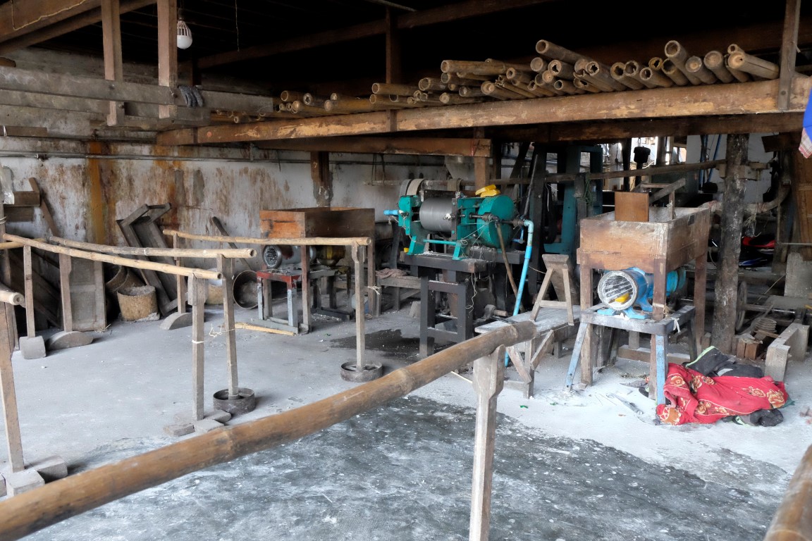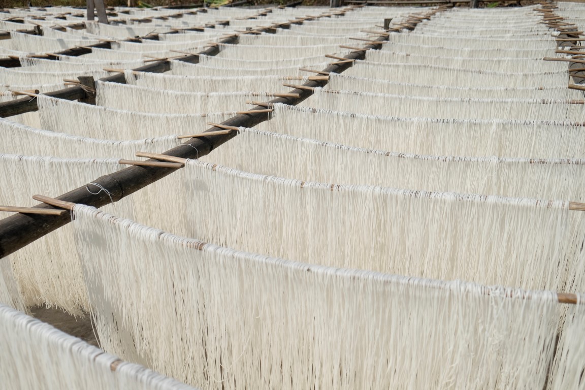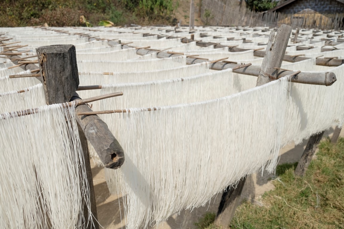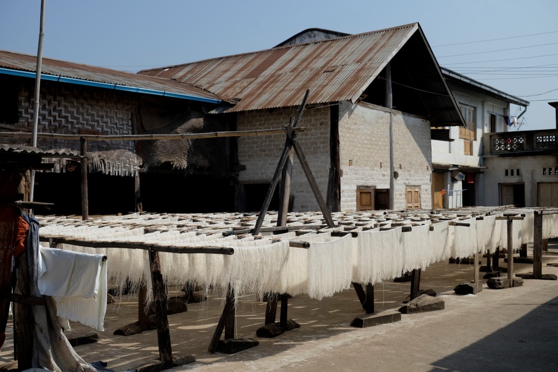 Izejot no klostera, uzskrienu virsū itāļu jaunietim, kas bija mans istabiņas biedrs Mandalejā – jauka atkalredzēšanās. Brīdi patērzējam un soļojam katrs uz savu pusi. Es dodos apskatīt vienu no šejienes makaronu ražotnēm. Pašu ražošanas procesu gan diemžēl neizdodas redzēt, jo nekas nenotiek, toties gatavā produkcija, žūstot saulē, veido labu foto materiālu.
