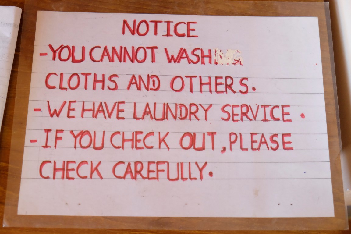 Savācam somas un pārceļamies uz blakus viesnīcu. Gulēšanas apstākļi šajā lētajā variantā vēl bija ciešami, bet vannasistaba gan pārsteidza pat tādus diezgan daudz redzējušus ceļotājus kā mani. Nopelējušas sienas, norūsējušas trubas, fantastiski netīra grīda, ledus auksts ūdens dušā (protams, tika solīts karstais ūdens), pods, kurā nekas neskalojas prom, un pāri visam – smaka, smaciņa. Arī kaimiņu viesnīca nav nekāds “hiltons”, bet šeit ir vismaz kaut kāda elementāra higiēna.
