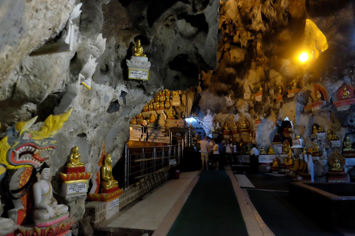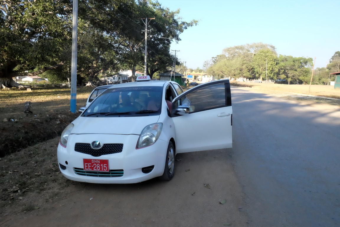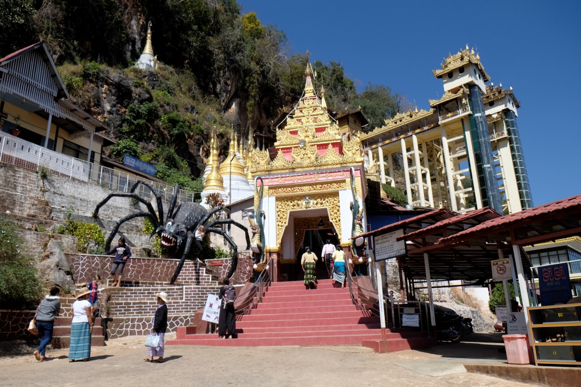 Apstaigājam pāris taksometrus un sarunājam šoferi, kas ir gatavs mūs visu dienu vizināt par aptuveni 6 eiro no galviņas. Līdz Pindaya, kur atrodas Budu ala, ir pusotras stundas brauciens. Nonākot galā, pārējie izvingrina kājas, uzkāpdami līdz alai pa kāpnēm, es aizvizinos līdz autostāvietai, no kuras līdz ieejai alā ir pavisam neliels kāpiens.