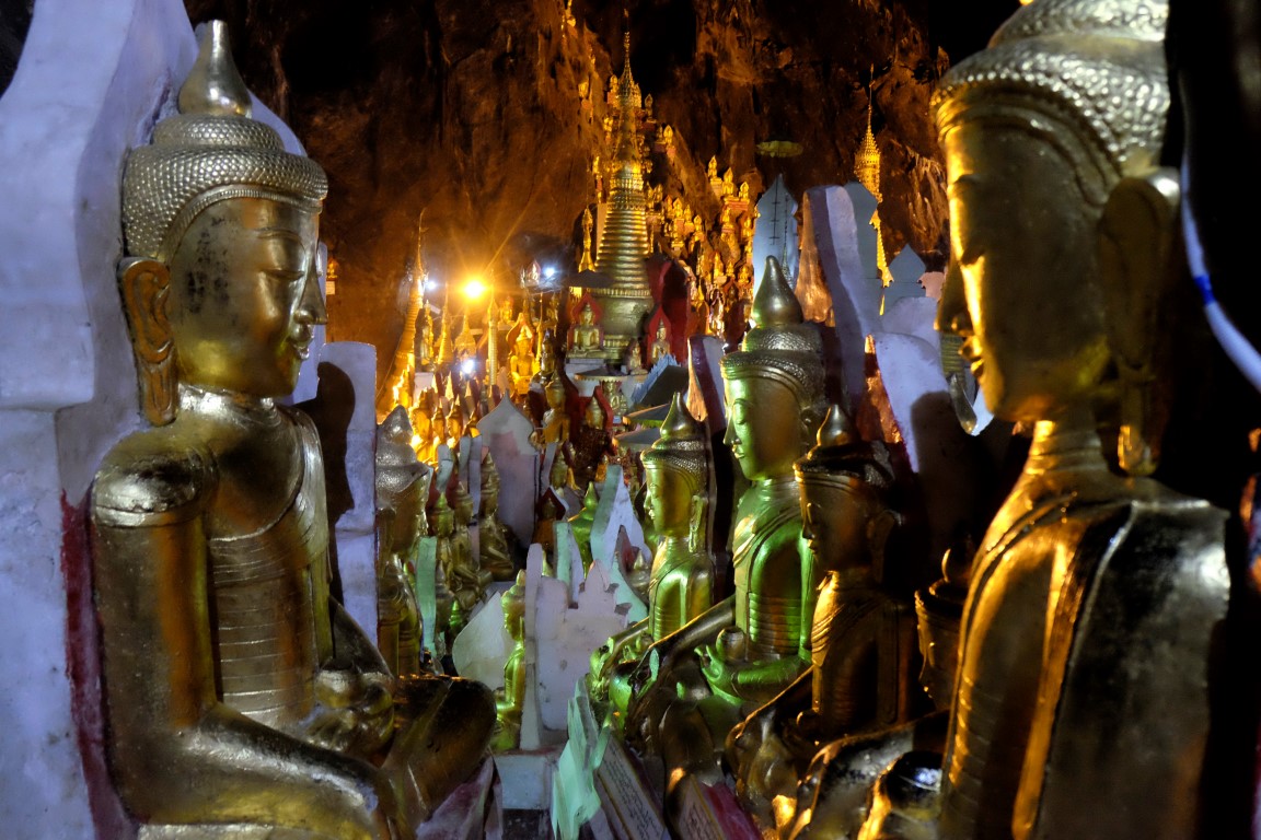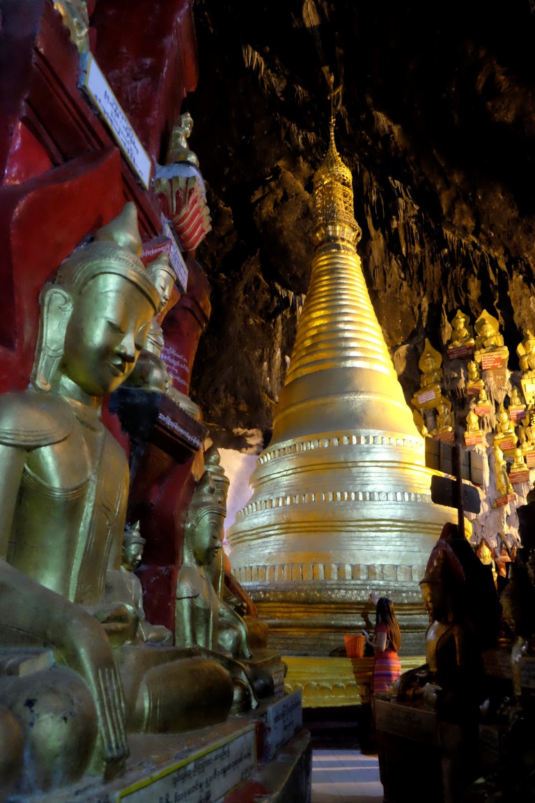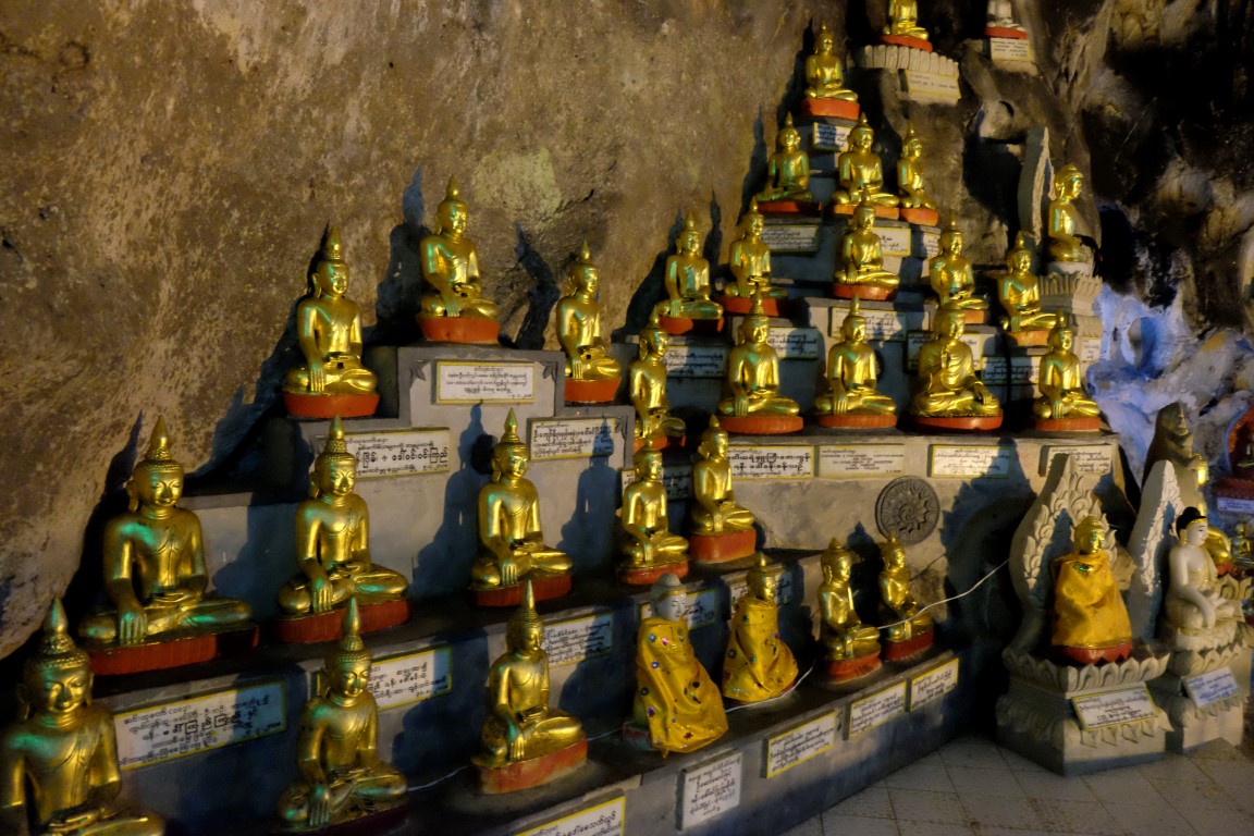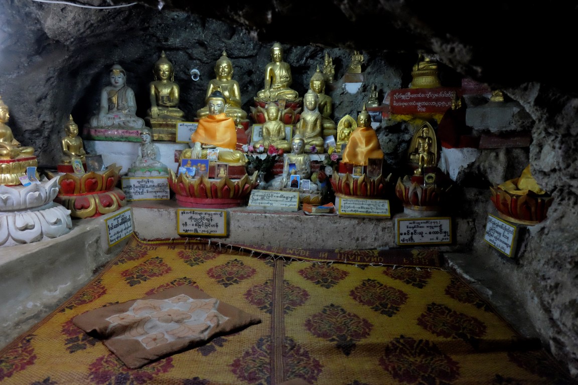 Apstaigājam pāris taksometrus un sarunājam šoferi, kas ir gatavs mūs visu dienu vizināt par aptuveni 6 eiro no galviņas. Līdz Pindaya, kur atrodas Budu ala, ir pusotras stundas brauciens. Nonākot galā, pārējie izvingrina kājas, uzkāpdami līdz alai pa kāpnēm, es aizvizinos līdz autostāvietai, no kuras līdz ieejai alā ir pavisam neliels kāpiens.