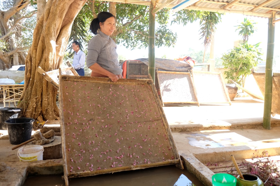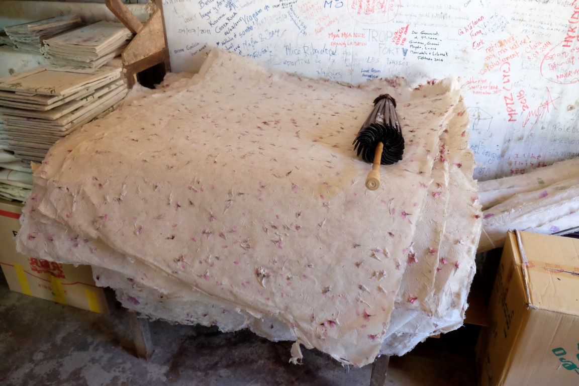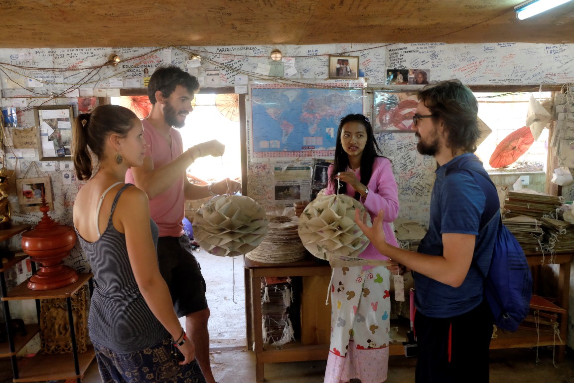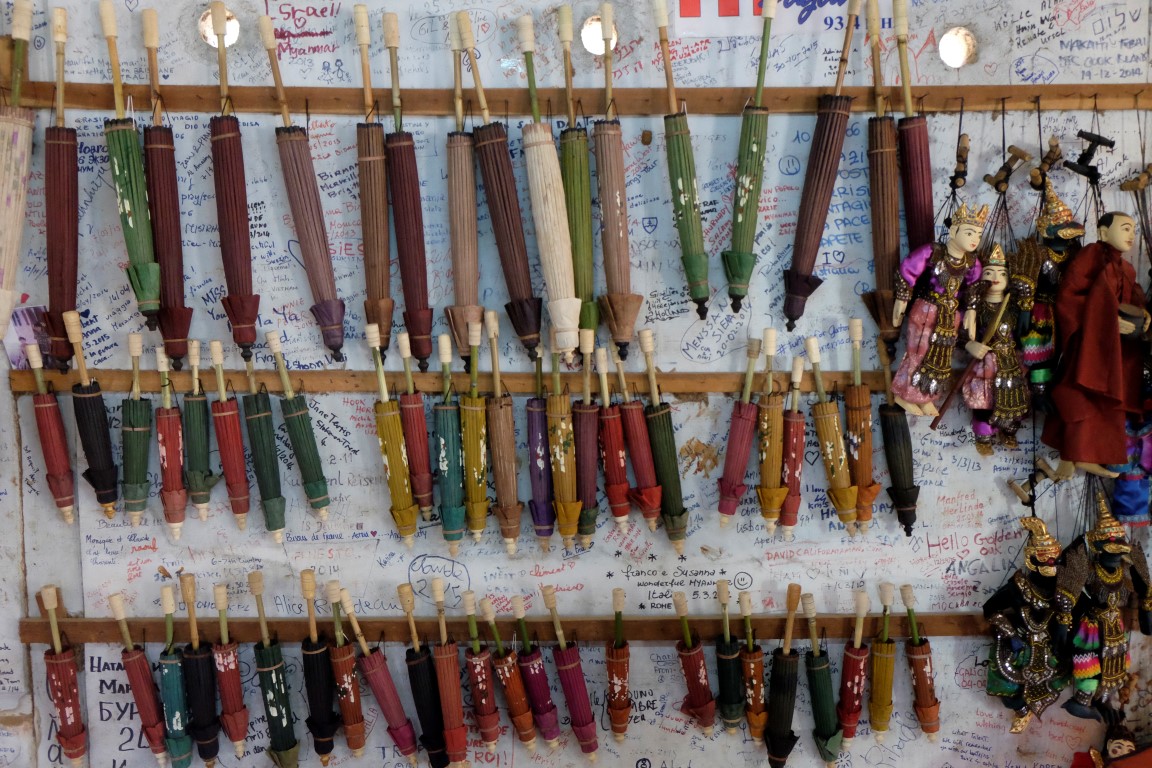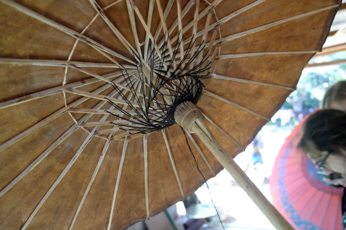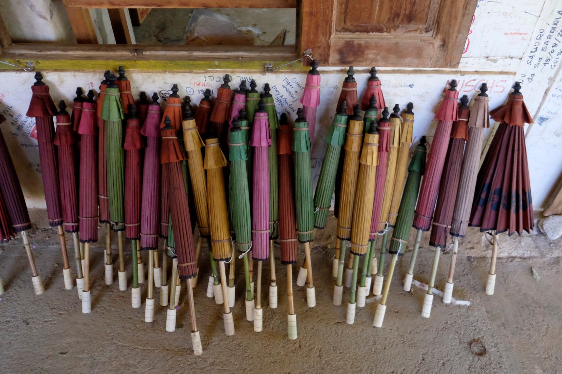 Pēc alas tiekam aizvesti uz papīra lietussargu izgatavošanas “fabriku”, kas ir ģimenes rūpals četrās paaudzēs. Dāmas demonstrē paša papīra izgatavošanas procesu – koka mizas mērcēšanu, sasmalcināšanu, ieklāšanu sietā, rotāšanu ar ziediem un žāvēšanu. No šī brīnumaini skaistā papīra top ne tikai lietussargi, bet arī gaismekļi, vēdekļi, piezīmju blociņi, bilžu rāmīši un citas smalkas lietas. Vīrs mums demonstrē, kā top lietussarga konstrukcija no koka un bambusa. Apstrādes rīki ir pavisam vienkārši, bet viņš ar tiem darbojas ar apbrīnojamu ātrumu un precizitāti.