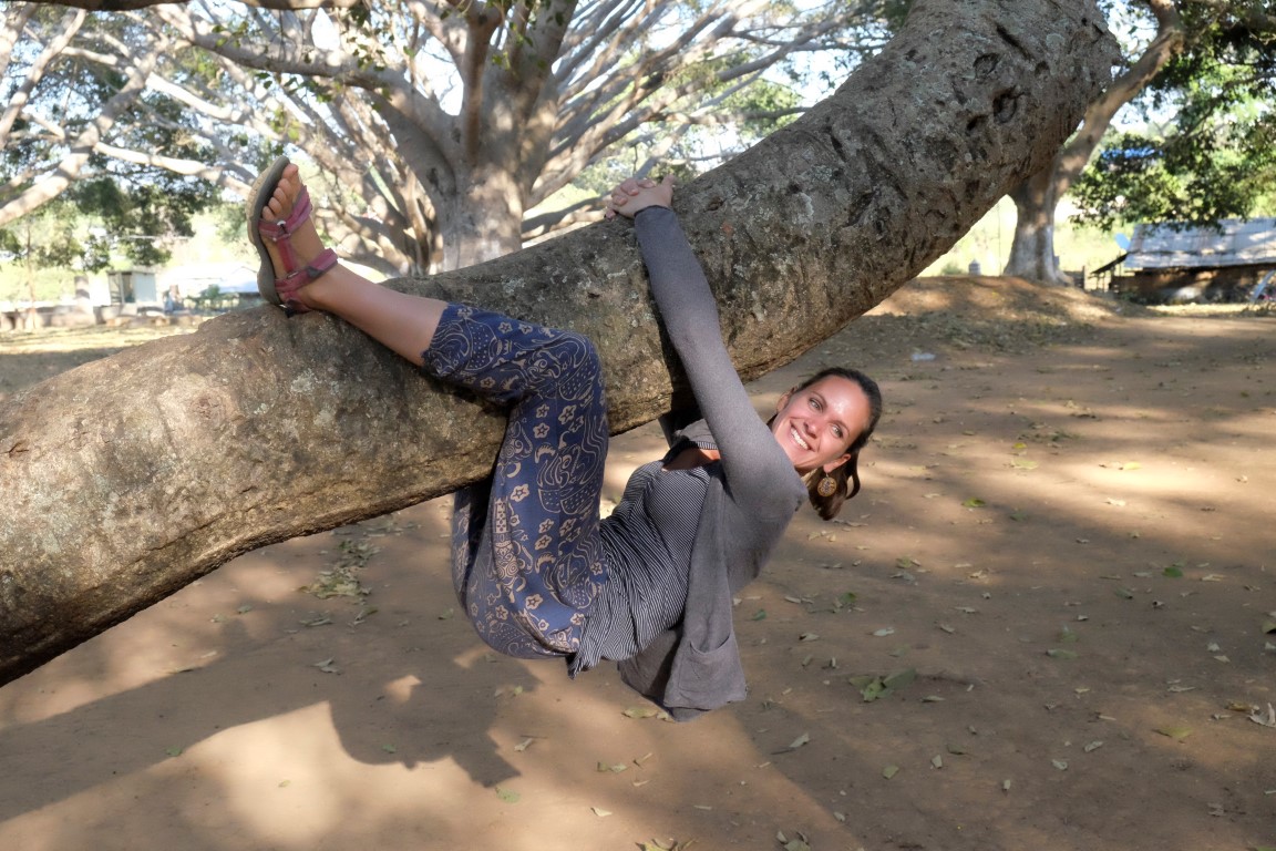 Atpakaļceļā apstājamies pie milzīgiem kokiem. Es pasūtu cukurniedru sulu, bet pārējie tēlo pērtiķus. Puiši uzlien tik augstu zaros, ka man galva griežas no skatīšanās uz viņiem. Safotografējamies dažādos leņķos, uzkožam mikro pankūciņas, ko sievas cep koku pavēnī, un laižam atpakaļ uz Kalaw, lai paspētu uz saulrietu.
