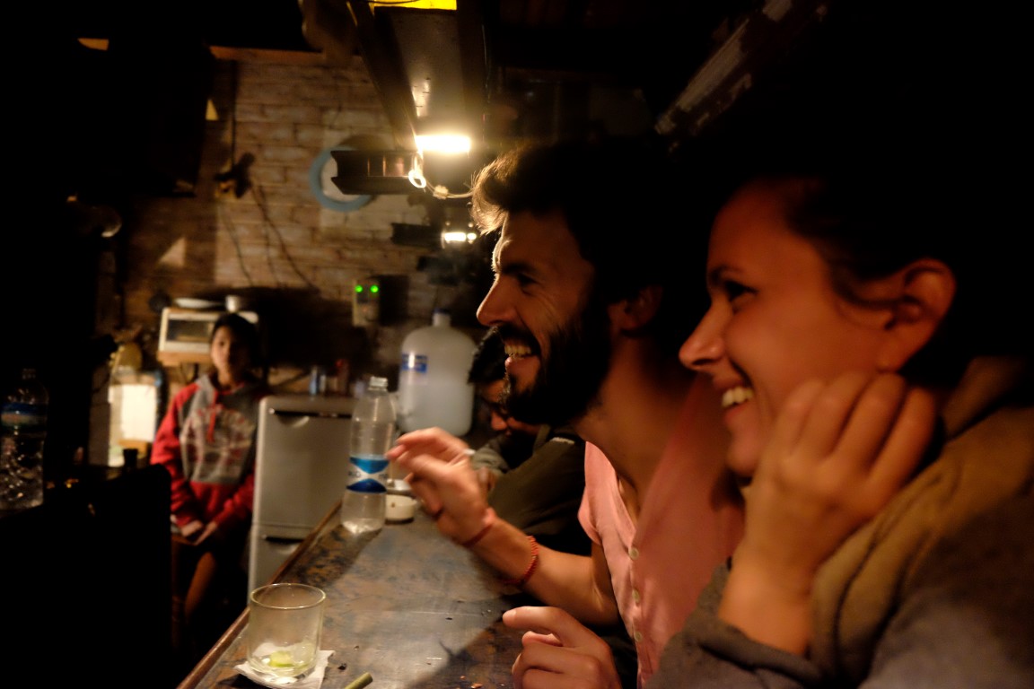 Pēc brīža mēs iestūrējam nelielā, tumšā vietā, kur vienā pusē sēž vietējie ļauži, stūrītī kārtis sit daži ārzemnieki, bet otrpus bāram lete ir brīva. Ieņemam vietas un pasūtām šejienes speciālo dzērienu – rumu ar laima sulu un spraitu. Vietējie spēlē ģitāru, iet vaļā gabali, kuriem visi dzied līdzi. Resns vīrs piebalso, sizdams ritmu uz savas motociklista ķiveres. Puiši cenšas nospēlēt arī kādu importa gabalu, bet ar tiem tik labi nevedas. Vai viņi zinot kaut ko no Bītliem, prasa Makss. Atbildes vietā viņam tiek pastiepta pretī roka ar beteles riekstu. “Beatles” vai “betel” – same same, angļu valoda Mjanmā bieži vien ir labs jautrības avots. Makss un Kamī ceļo pusgadu, ir diezgan daudz ko redzējuši un piedzīvojuši. Kad ejam atpakaļ uz viesnīcu, Makss atzīst, ka omulīgajā atmosfērā un smieklos pavadītais vakars, esot bijis viens no labākajiem visā ceļojumā.
