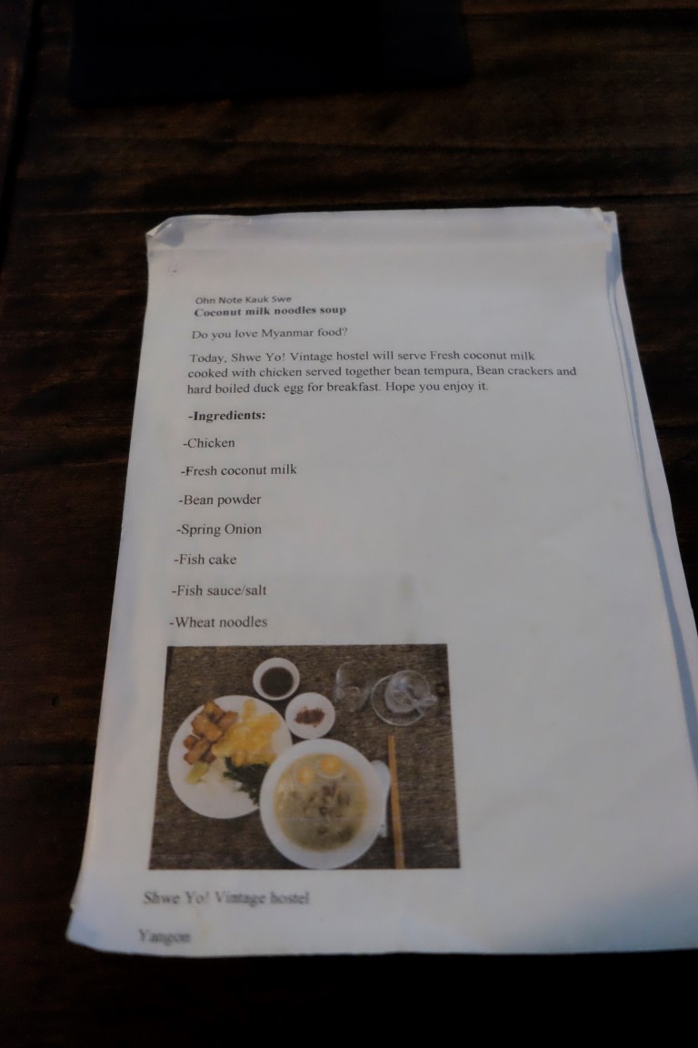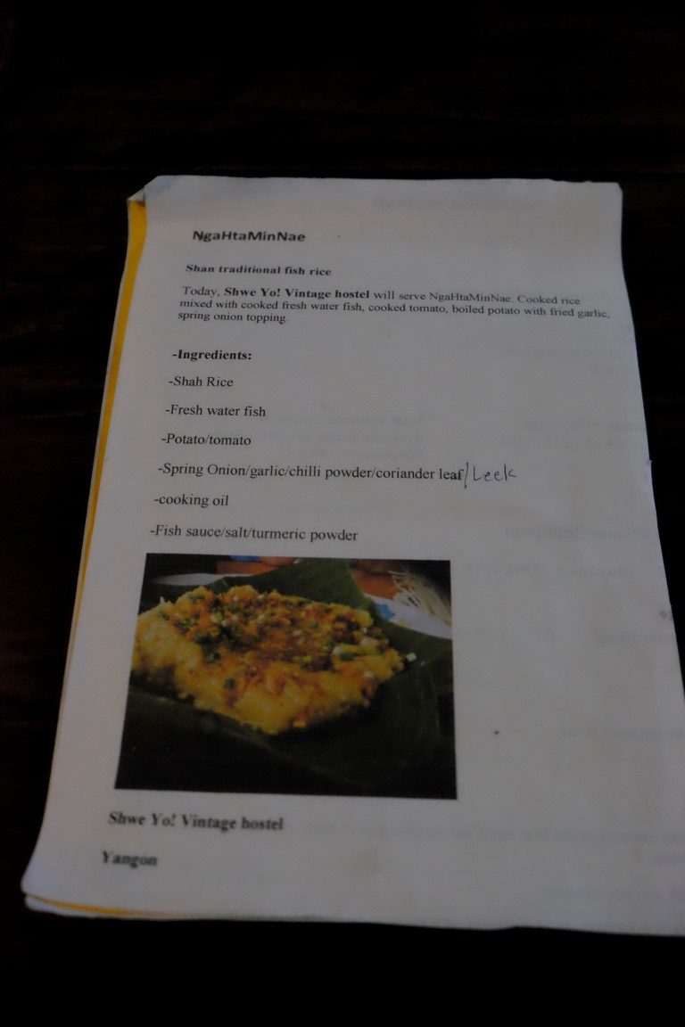 Ir patīkami atkal būt Jangonā, kuras ģeogrāfija ir labi pazīstama. Vēl jo patīkamāk ir apsveicināties ar hosteļa saimniekiem. Esmu noilgojusies pēc Nangsanas gatavotā ēdiena, tāpēc pasūtu brokastis, kas man šodien vēl nepienākas. Tik garšīgi!! Bildēs var apskatīt pāris Nangsanas receptes iedvesmai!