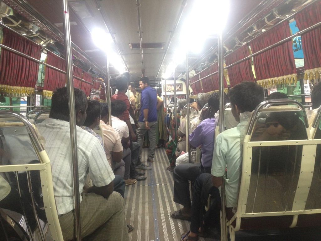 Atrodu pieturai līdzīgu objektu un apvaicājos diviem vīriešiem ar koferiem, vai viņi dodas uz centru. Jā, jā. Vai viņi man arī var parādīt, kurš autobuss ir pareizais. Ok. Tikmēr vēroju pienākam citus autobusus, kuriem ap durvīm salipuši jaunieši kā vīnogu ķekari. Ko lai saka, neesmu droša, ka savā pirmajā Indijas dienā esmu gatava šādai pieredzei. Tomēr, kad pienāk īstais autobuss, tas ir pilns, tomēr var tikt iekšpusē, nevis karāties durvīs, kas jau ir labi. Brīdi stāvu un skatos apkārt. Kāpēc ar autobusu brauc tikai vīrieši? Tad man ienāk prātā, ka šeit, līdzīgi kā Indonēzijā, varētu būt autobusa sadalījums dzimumiem – priekšā sievietes, aizmugurē vīrieši. Cenšos saskatīt autobusa priekšgalā notiekošo – kā tad, tur pulcējas sievišķi. Neko darīt, šobrīd nav nekādu cerību pārvietoties, braukšu vien “pa vīrieti”. Kādu brīdi domāju, ka arī “pa zaķi”, tomēr konduktors uzrodas un prasa naudu. Dodu viņam mazāko banknoti, kas ir manā rīcībā – 1o rūpijas (0,14 eur) un viņš man vēl kaut ko izdod. Jauki. Konduktors grib zināt, līdz kurienei braukšu, bet varu viņam vien atbildēt, ka līdz centram. Drīz par šo tēmu sāk interesēties arī citi pasažieri. Nolemju pateikt, jo galu galā – ne es zinu, uz kurieni iet šis autobuss, ne to, kā nonākt līdz man vajadzīgajai vietai otrpus upes. Dažas minūtes pusautobuss diskutē, kā man vajadzētu braukt, tad viens, kurš tā labāk runā angliski, pastāsta, ka man jābrauc ar šo busu līdz gala pieturai, tur jāpārsēžas citā busā.