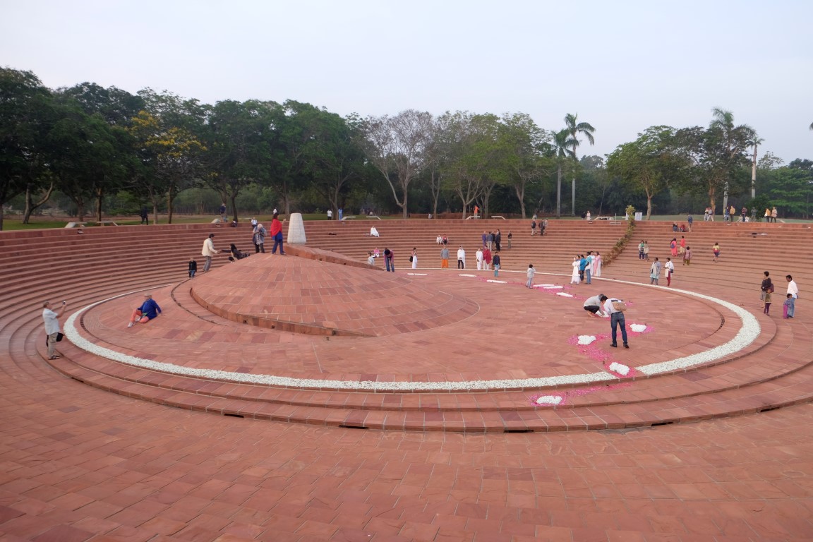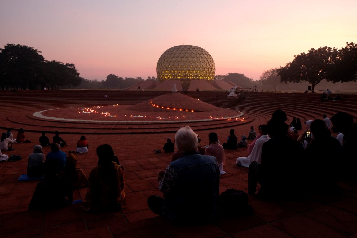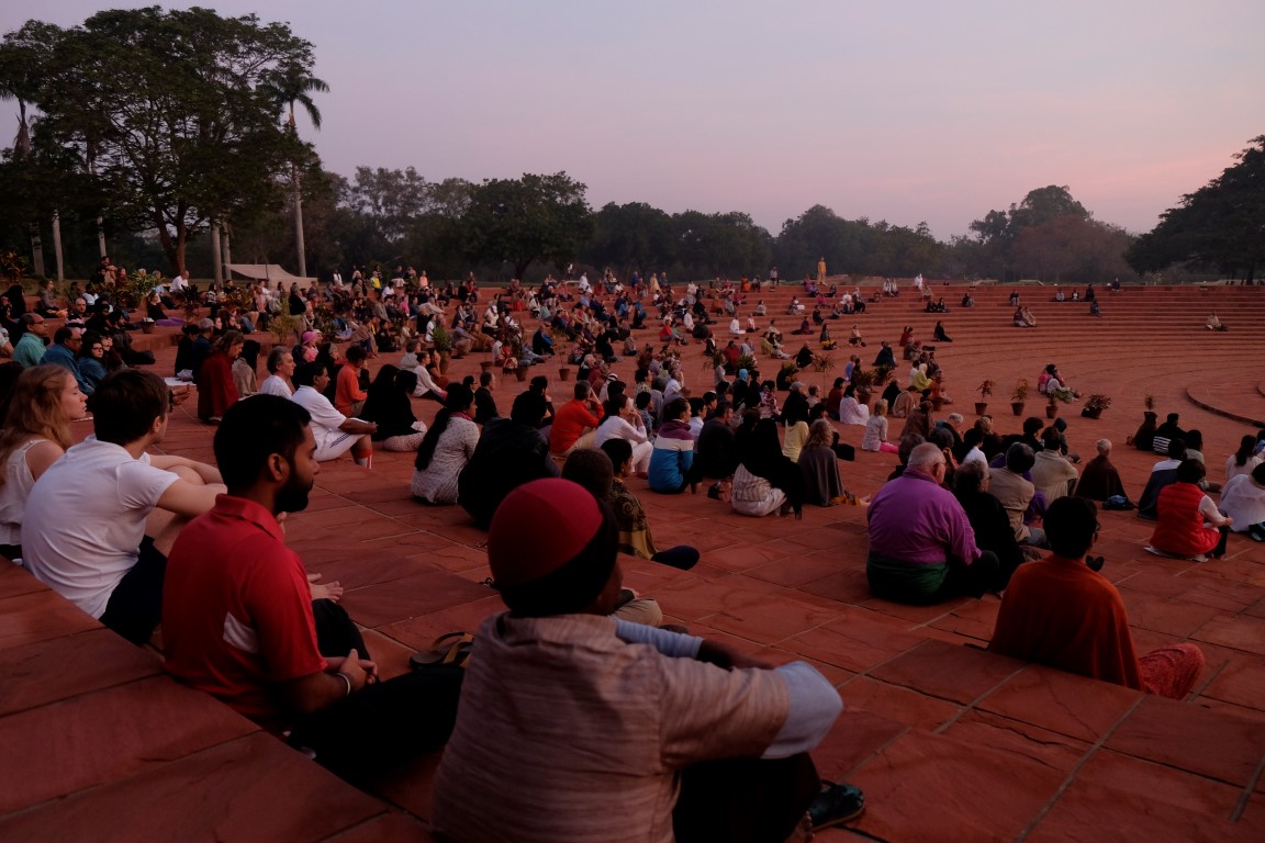 Tuvāk Matrimandir jau kļūst biezāks, ļaudis sarodas no visām pusēm. Sanākušie sapulcējas amfiteātrī, kura centrā aizdegtas svecītes un izklāti ziedu rotājumi. Ceturksni pirms sešiem sākas meditācija. Katrs pieslēdzas savā veidā, citi piedalās vienkārši vērojot notiekošo. Šoreiz arī drīkst fotografēt, tāpēc atļāvos aizlienēt pāris šodienas bildes vakardienas ierakstam.