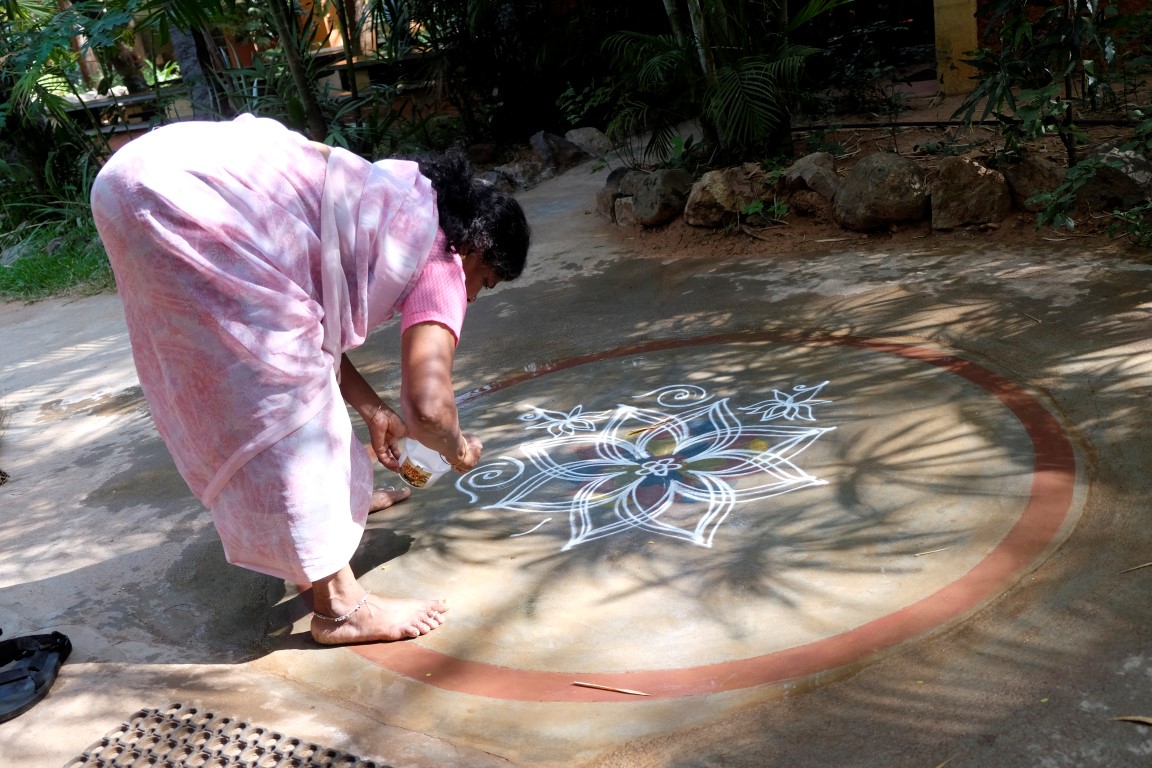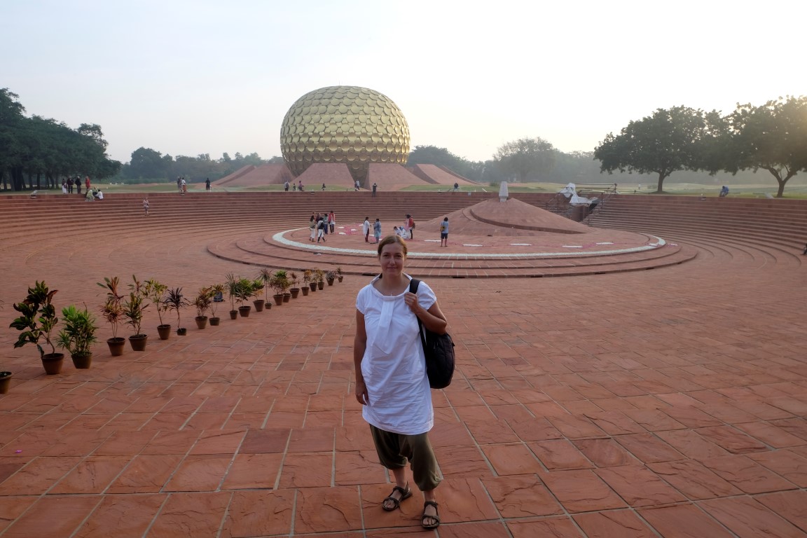 Pirms pieciem iededzu pieres lukturīti, atslēdzu velosipēdu un laižos tumsā. Apkaime vēl guļ, vien retās mājas priekšā kāds samiegojies indietis apdara rīta darbus. Krietnu laiku braucu pa ceļu viena. Sāku jau bažīties, vai tiešām neesmu neko sajaukusi un Aurovilas radītājas dzimšanas dienas meditācija ir no rīta. Nomierinos vien, kad garām uz moča patraucas divas meitenes baltos tērpos.