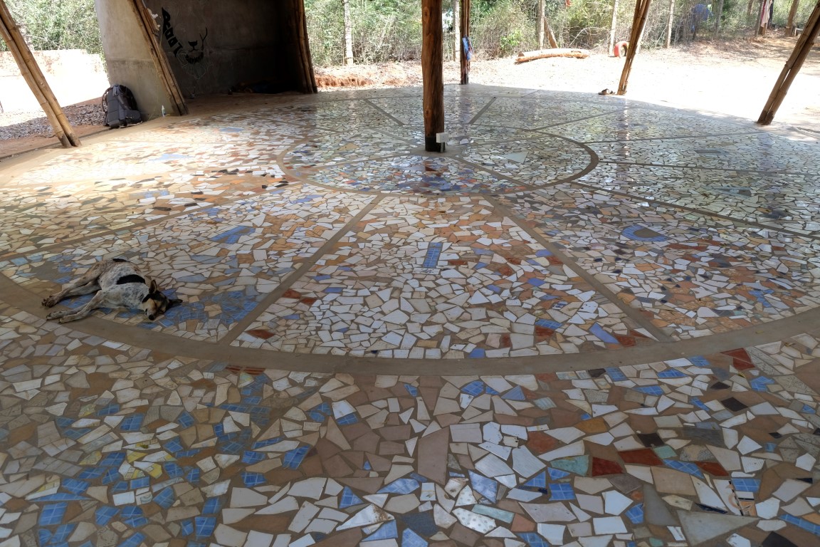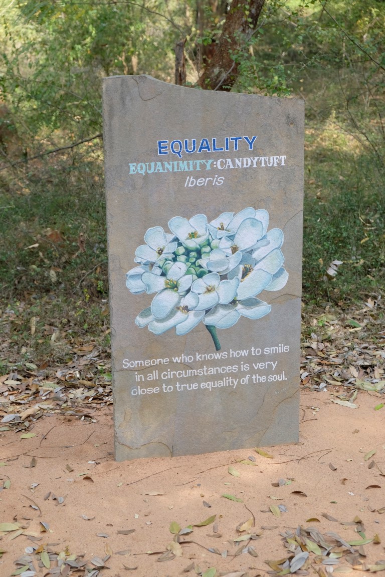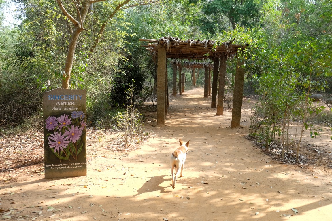Ielecu autobusā, kas dodas uz Apmeklētāju centru, gribu tur noskaidrot pāris jautājumus. Piebraucot mani brīdina, ka nākamais autobuss atpakaļ iešot pēc desmit minūtēm. Kad tās ir pagājušas, eju uz pieturas vietu, bet autobuss jau esot prom. Kopš vakardienas joprojām esmu tādā puseiforijā un pie sevis nodomāju: “vai cik jauki, autobuss aizgājis”. Un sāku soļot uz bumbu kājām. Tas tik tiešām ir jauki, jo, pirmkārt, pa ceļam var iepazīties ar Mātes dotajiem nosaukumiem katrai no 12 Matrimandir ziedlapiņām un tām atbilstošajām puķēm. Otrkārt, man kompānijā uzrodas franču kungs, ar kuru sākam tērzēt. Viņš man pastāsta par Aurovilai līdzīgu kopienu, kas dzīvo Skotijā un arī par šo vietu tās pirmsākumos. Pirmo reizi Mišels Aurovilā ciemojies pirms 35 gadiem – no Matrimandir esot bijis redzams vien karkass. Bet visvairāk viņš ir pārsteigts par to, cik ātri aug koki. Tolaik šeit esot bijusi kaila zeme, ar dažiem kokiem, bet tagad visa apkaime ir zaļa.
