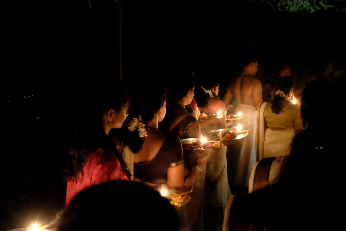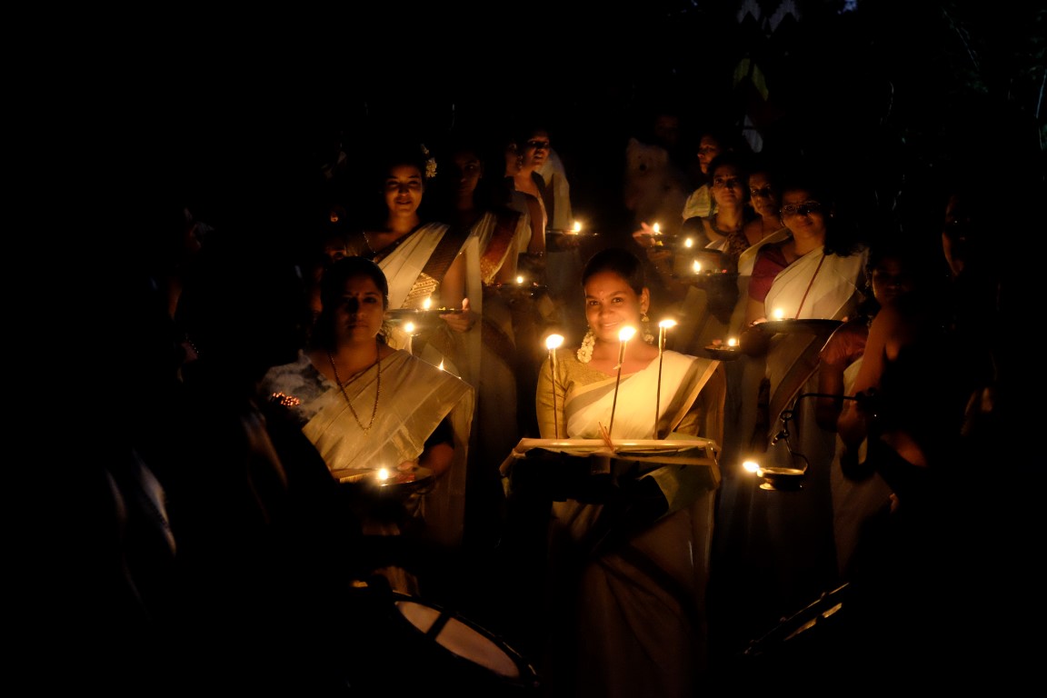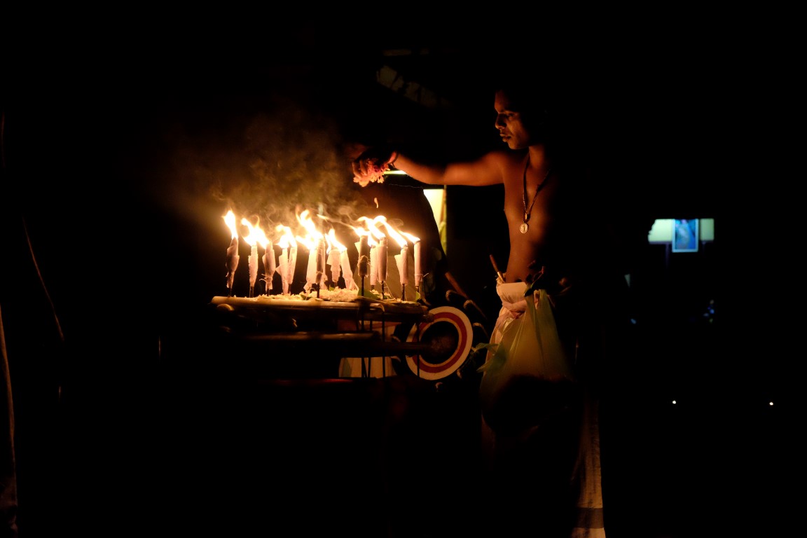 Sāk satumst un top redzams, ka ļaudis kaut kam gatavojas. Izrādās – ceremoniālam gājienam. Iesākumā visi aizsoļo līdz lielajam ceļam, lai no turienes uzsāktu procesiju. Iesākumā iet bungu sitēji, tad seko šamanis un centrālā meitene ar uguņiem rokās, pēc tam nāk skaistules gaišos tērpos ar degošiem vaska trauciņiem un ziedu kompozīcijām. Procesija atgriežas pagalmā un noliek ziedus un sveces centrālajā notikumu norises vietā.