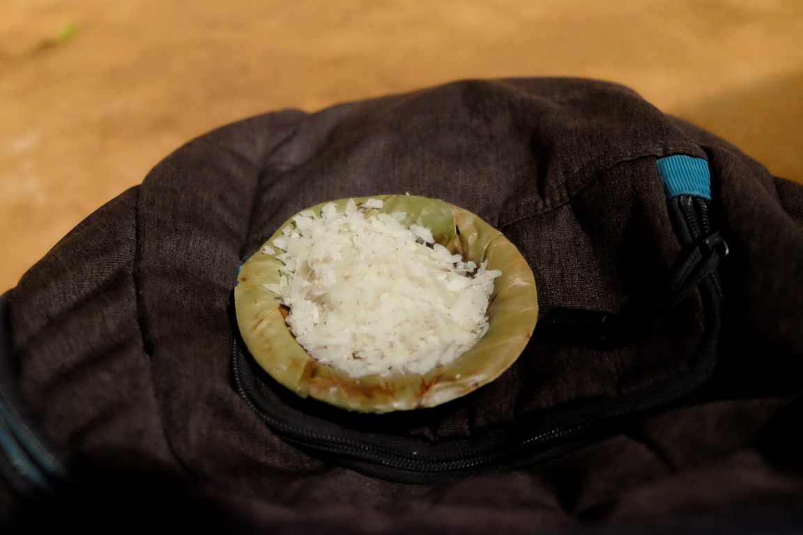 Nākamā sadaļa ir pati dīvainākā. Šamanis apsēžas pie tāda kā altārīša un darbojas ar kvēpekļiem, mētā pa gaisu ziedus, bārsta visādas vielas. Viss būtu jauki, ja viņš to nedarītu…. stundu. Man blakus sēž britu jaunietis Teilors, ik pa laikam vismaz varam apmainīties ar kādu joku par šo tēmu. Noslēgumā šamaņa uzmanības centrā ir milzīgs “zupas katls”, kurā iemērkts ziediem rotāts zobens un visādi citi labumi. Kad “zupa gatava”, šamanis iesākumā izzvejo visu cieto frakciju un tad sāk šļakstīt ārā šķidrumu. Diemžēl par ātru izslēdzu filmēšanas režīmu un palaižu garām, kā šis kā dulls ārdās ar to zupu un beigās lepni apgriež otrādi tukšo katlu. Puspagalms pludo ar sarkanīgu šķidrumu – šamanis savu ir paveicis.