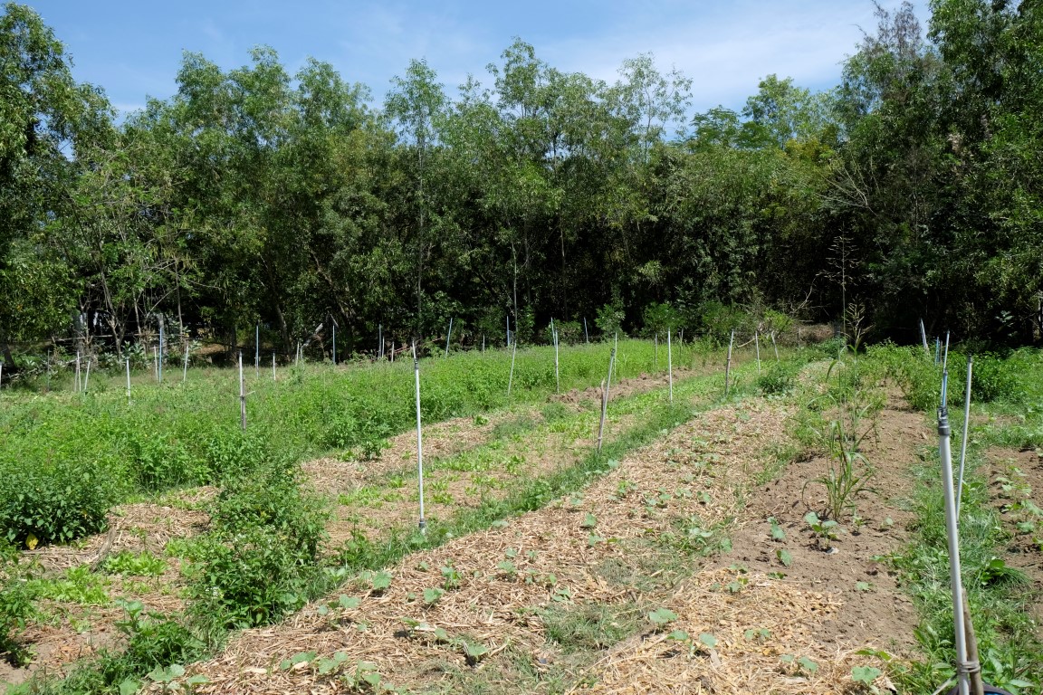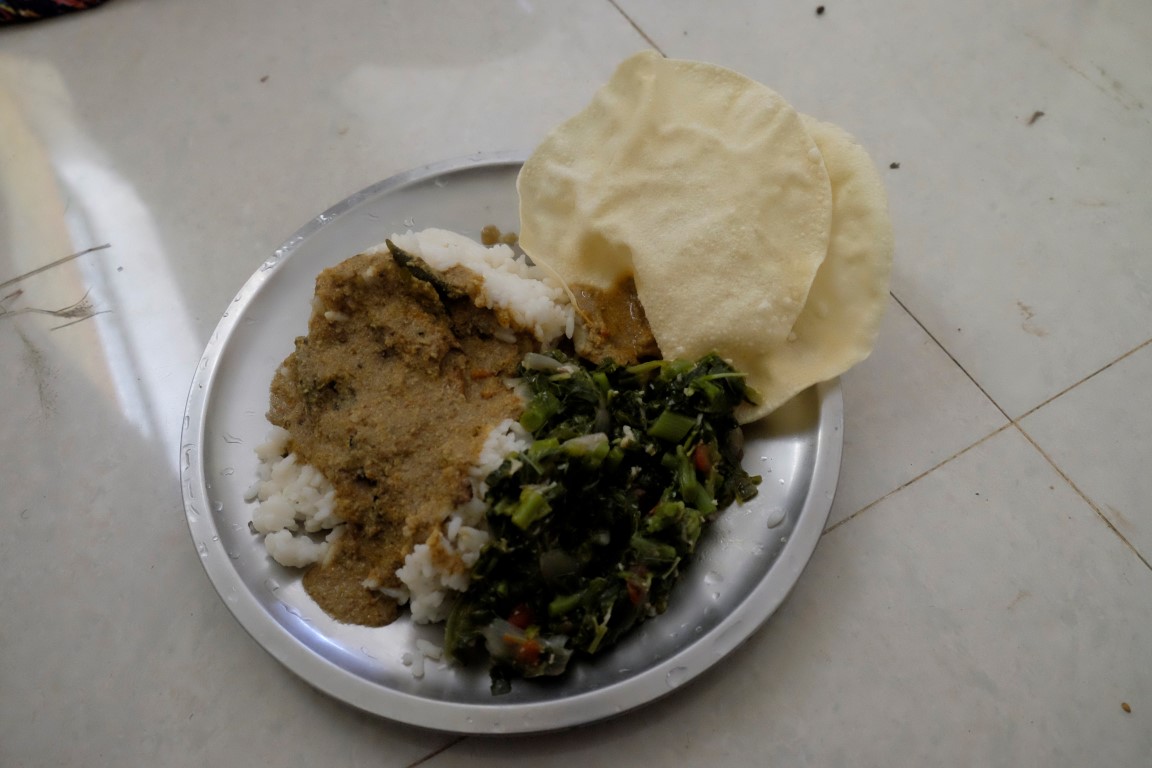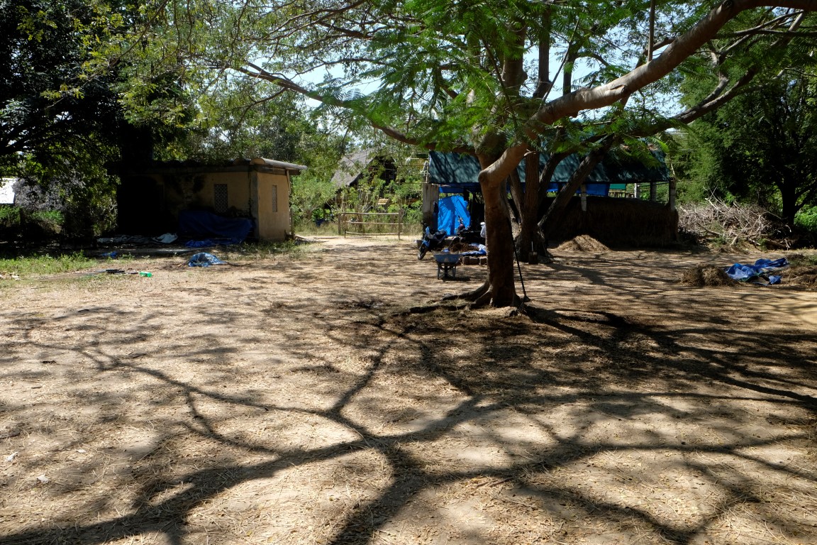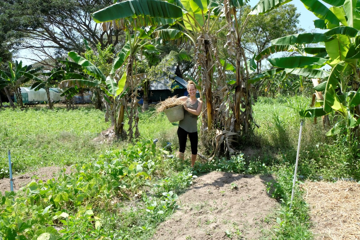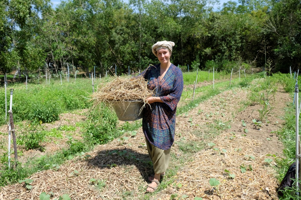 Dārzā gan mani neviens tā uzreiz nelaiž, šodien steidzamāks darbs esot sagrābt sētsvidu, savācot izkaisīto sienu un sabirušās lapas – šāds mikslis tiek izmantots izravēto dobju mulčēšanai, lai pasargātu zemi no straujas izžūšanas. Ķeros krāt ar prieku un entuziasmu – tik labi darīt ko noderīgu. Savācu ar lāpstu govju mēslus, tad salasu žagarus, ierīkoju maisu plastmasas atkritumiem – esmu pilnībā noskaņota padarīt šo pagalmu par tīrāko kaktu Indijā. Viss būtu labi, ja pēc trīs stundu aktīvas grābšanas manas baltroča plaukstiņas nesāktu lūgties, ka šodienai pietiks. Citiem vārdiem sakot – man ir tulznas. Tomēr darbu negribas atstāt pusdarītu, tāpēc iemanos turēt grābekli citā satvērienā un kā nebūt pieveicu pagalmu. Tad parādās Feja un paņem mani savā komandā – saliekam sagrābto mulču ap tikko izravētajiem gurķiem. Drīz vien klāt ir pusdienlaiks. Tiekam pie Indras gatavotā ēdiena – rīsiem, vistas mērces, sautētiem dārzeņiem un svaigiem salātiem.