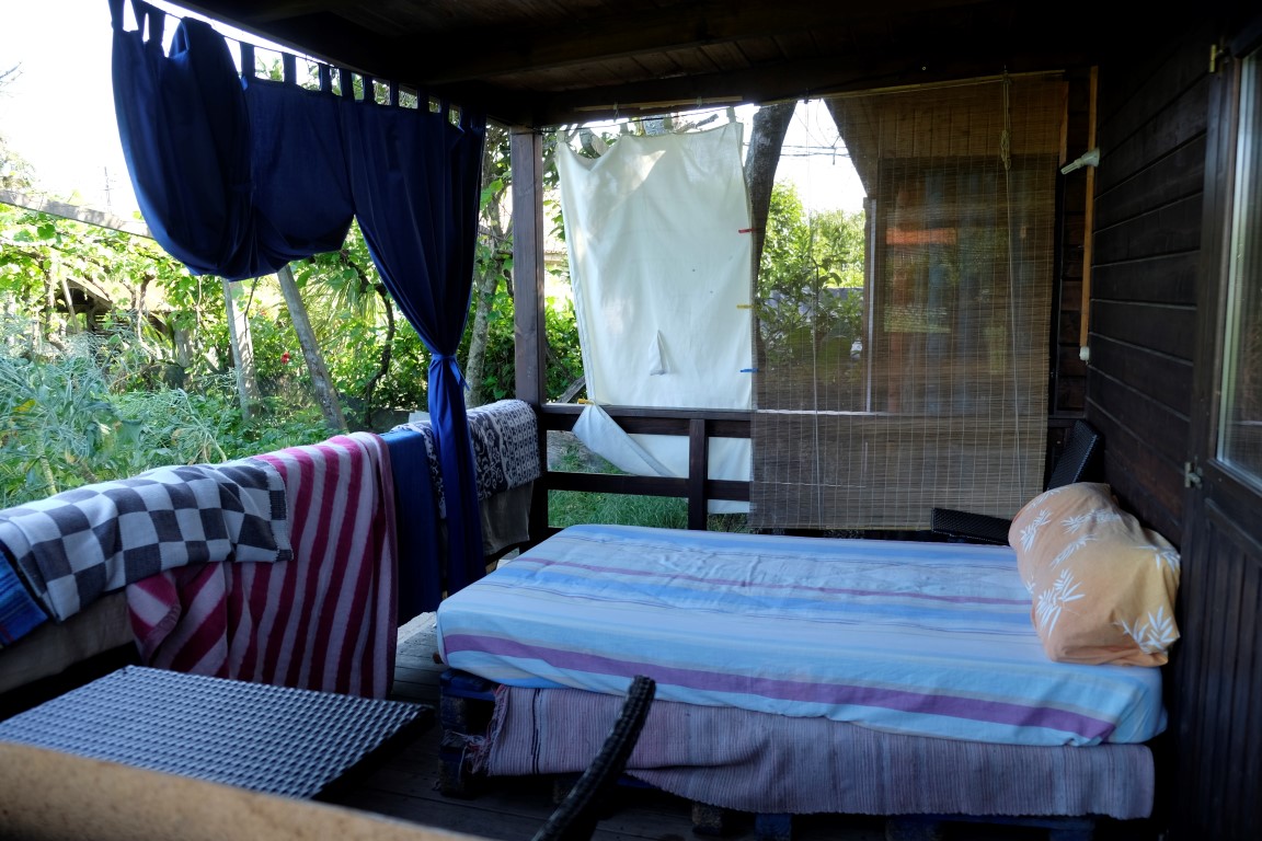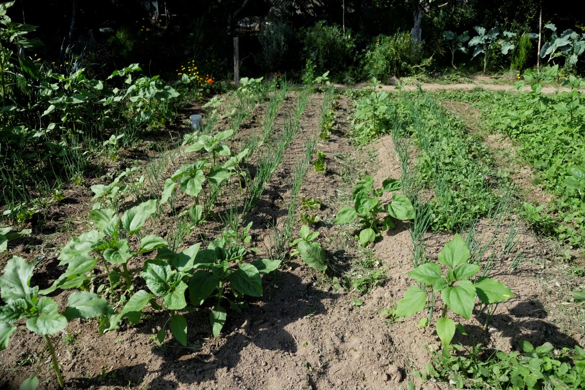 Pēc jogas lēnām izstaigāju dārzu, tas burtiski prasās pēc papildspēkiem. Tieši iznāk saimniece pabarot cūkas un vistas. Man ašā ideja ir klāt. Tā kā šī ir vieta, kurā viss notiek par ziedojumiem, prasu saimniecei, kā viņa skatītos uz darījumu, ja es daļēji norēķinātos naudā un daļēji darbā. Viņa apdomājas un saka, ka principā palīdzīga roka dārzā nenāktu par skādi, vien raizējas, ka šodien svētdiena – neklājoties strādāt. Mierinu viņu, ka man ceļojot katra diena kā svētdiena un ka darbs dārzā jau ir tīrais prieks, nevis strādāšana. Labi, tieku pie divām aizaugušām puravu – salātu dobēm un ķeros pie lietas. Zeme ir mīksta, nezāles pašas lec laukā. Krietnu stundu darbojos pa dobēm, tad darbiņš galā. Jāķeras pie nākamā – rakstīšanas. Apsēžos ar datoru pie pārējiem un ar vienu smadzeņu puslodi piedalos sarunās, ar otru – šķiroju bildes. Rakstīšanas brīdī gan nepieciešama visa uzmanība.