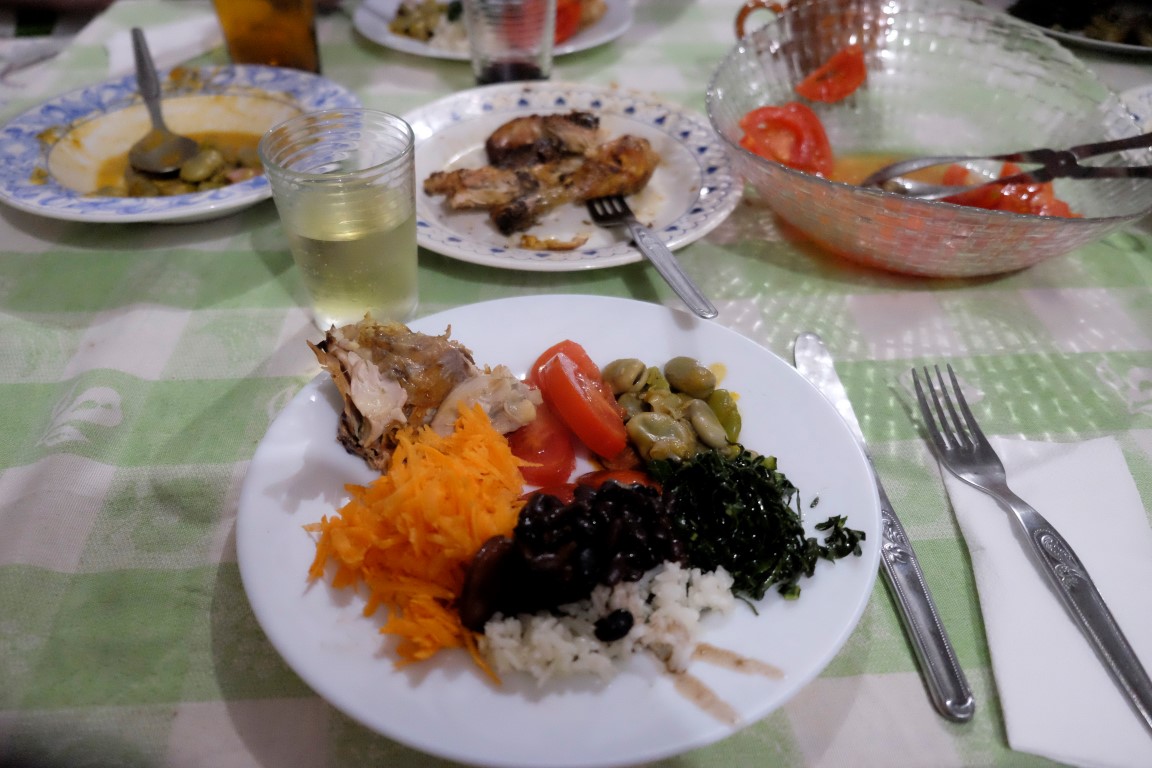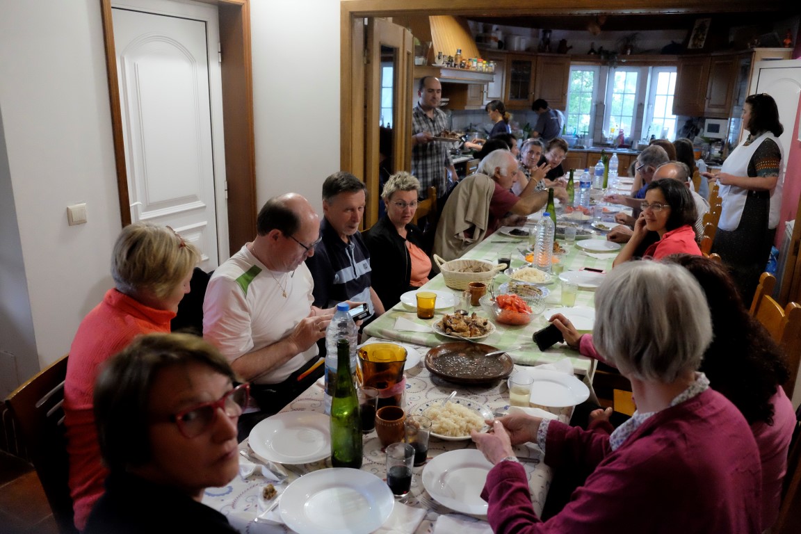 Esmu tikusi pusē, kad saimnieki sauc vakariņās. No virtuves līdz blakus telpai stiepjas garš galds, katrā pusē vieta padsmit cilvēkiem. Iesākumā tiek servēta zupa – krietni labāka nekā vakar restorānā. Pēc tam nāk otrais – galda vidū tiek servēti šķīvji ar tomātiem, burkāniem, cūku pupām, pupām, rīsiem, vistu. Viss garšo lieliski. Un, klāt krūkas ar balto un sarkano vīnu. Pēc brīža visi sten un kunkst no labsajūtas. Es atvainojos un pazūdu no galda pabeigt rakstu darbus. Joprojām esmu ārā viena, bet no mājas skan jestras vācu melodijas un plaukstu sišana. Iznāk Petra un saka, ka man noteikti jānāk atpakaļ – es šobrīd nokavējot lielisku materiālu blogam.
