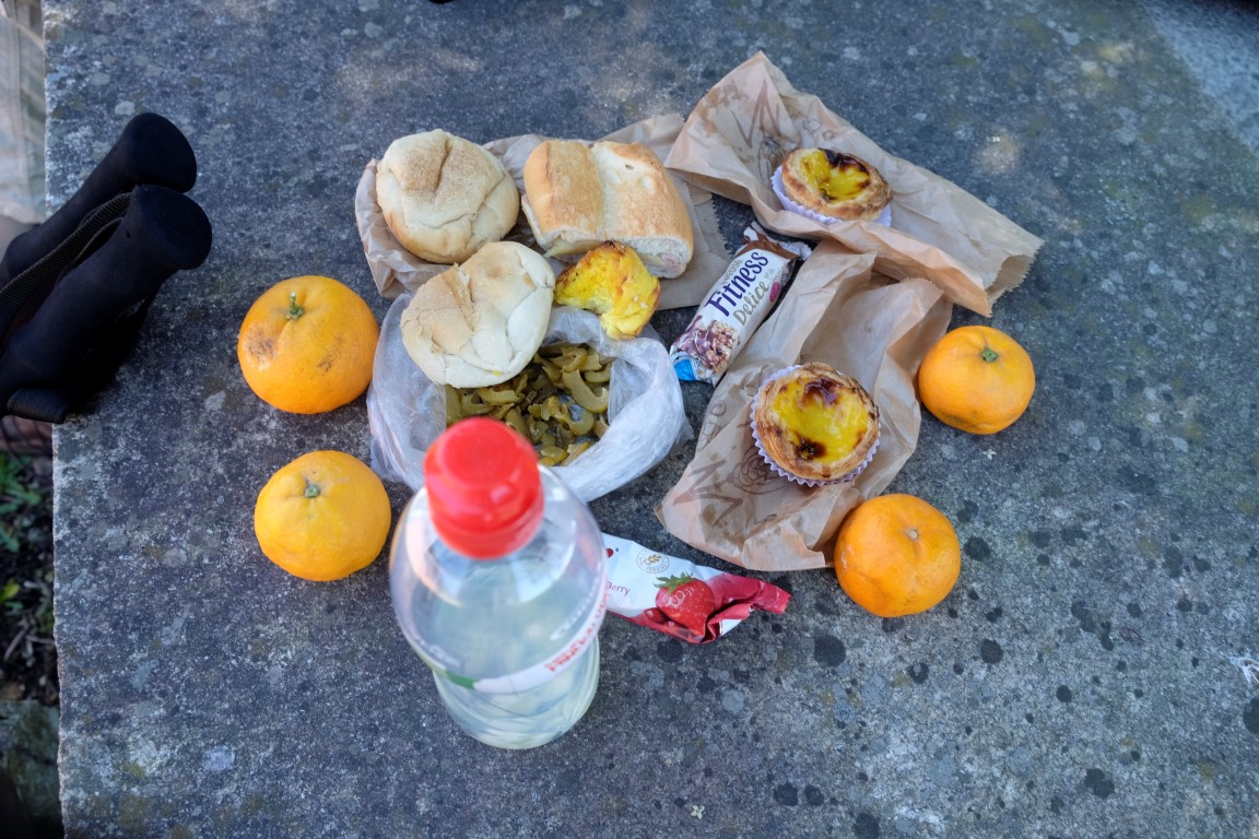 Dienas vidū esam sasnieguši pirmo auberģi, pie kuras ieturam pusdienas. Izvelkam no somām visu, kas aizķēries un paēdušas esam. Tā kā šodien ir svētdiena un vairums veikalu ir ciet, mums nav īsti, ko likt uz maizes. Es šo jautājumu atrisinu, saliekot bulciņā mandarīna šķēlītes. Tīri neko! Jā, arī šodien mums pa ceļam gadījās dāsna mandarīnu koku audze.