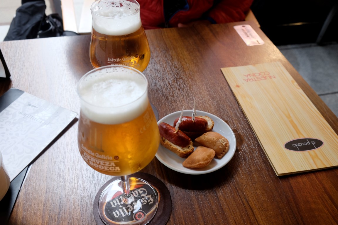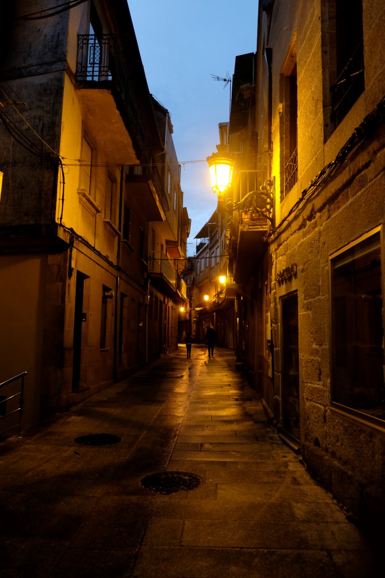 Pēc nelielas snaudas tomēr saņemos dušai, pēc tam uzrodas arī apetīte. Labi, par spīti nogurumam, aiziesim uz pusotru kilometru attālo centru paēst vakariņas un apskatīt vecas ēkas. Pa ceļam Petra zvana mājiniekiem, lai pavēstītu, kur atrodamies: “Nē, nevis Tante Petra, bet Pontevedra”.