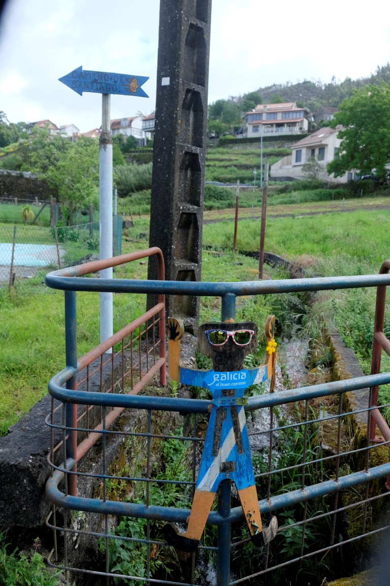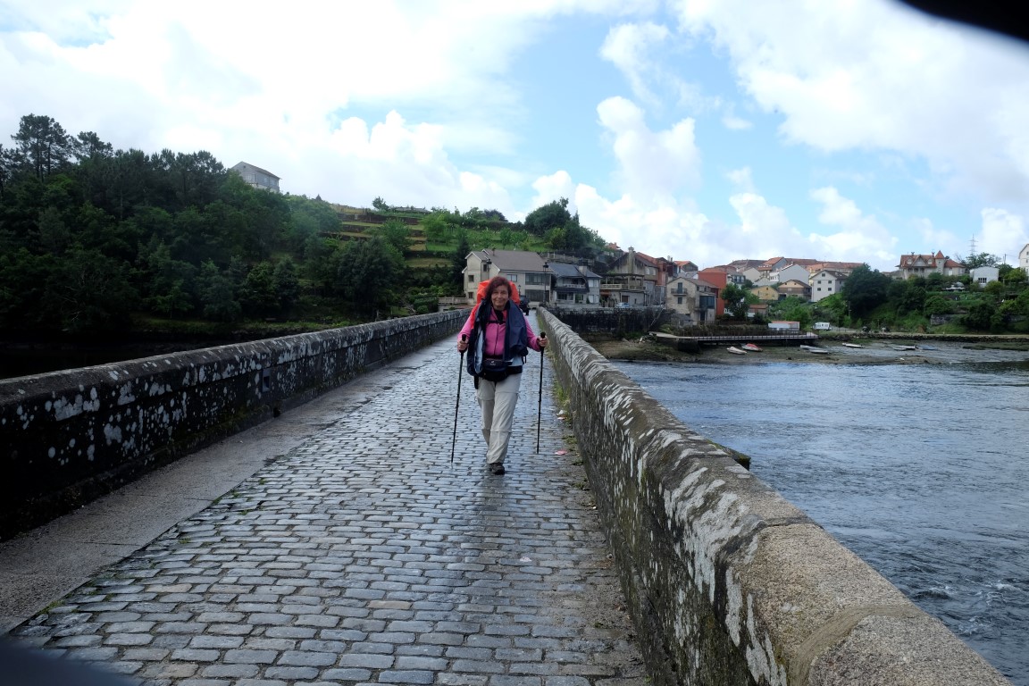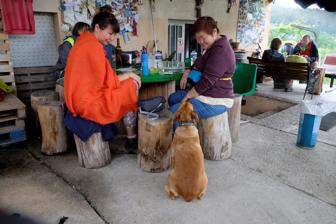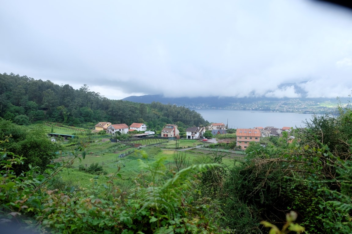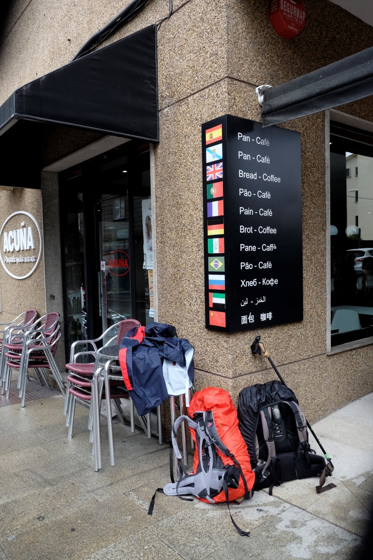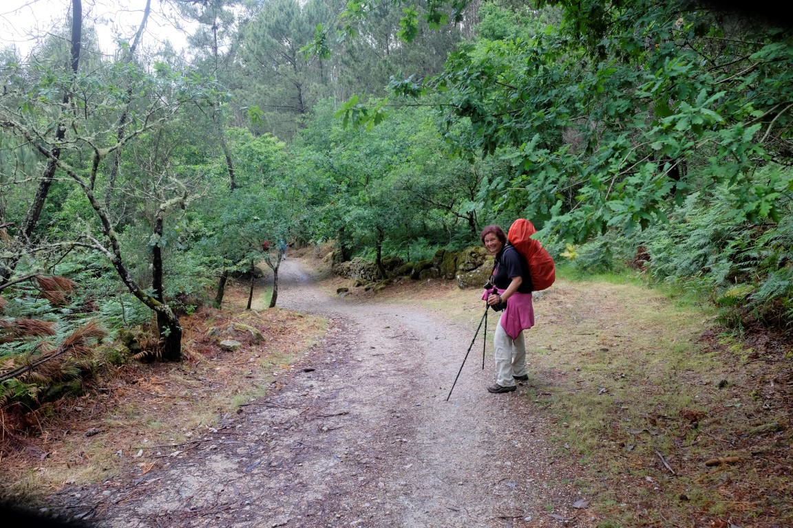 Pēc kafijas pauzes laiks mazu brītiņu mūs saudzē, tad atkal no gaisa sāk krist slapjums. Plānotajā vietā šoseju šķērso Camino, esam atpakaļ pie bultām. Arī autobusa pieturām piemīt līdzīga spēja kā bāriem, to tuvumā sāk līt stiprāk. Apsēžamies vienā no tām un domājam, ko darīt. Apkārt viss ir apmācies, debesīs nav ne mazāko cerību. Esam tuvu domai par autobusu līdz šodienas galamērķim Pontevedrai. Petra aizsūta mājiniekiem nelielu videosveicienu, kā mēs izklaidējamies autobusa pieturā. Pašas smejamies – ja kāds prasīs, kur mēs pavadījām atvaļinājumu, varēsim atbildēt, ka pamatā autobusa pieturās.