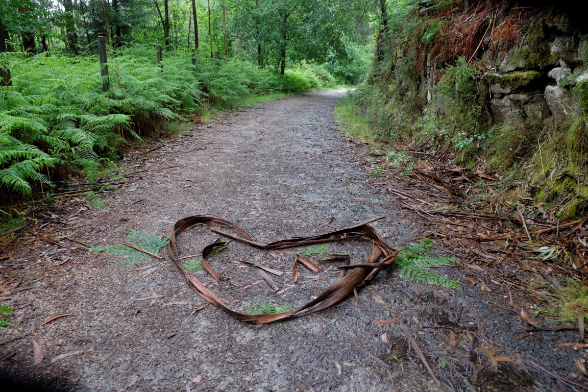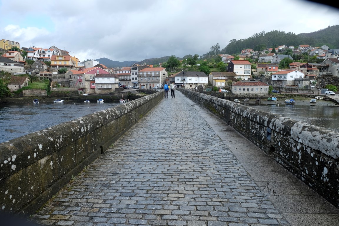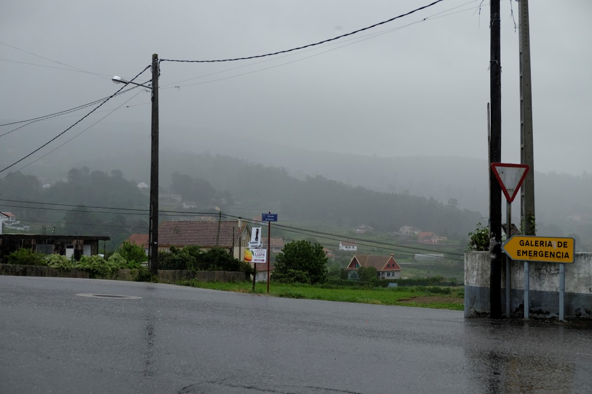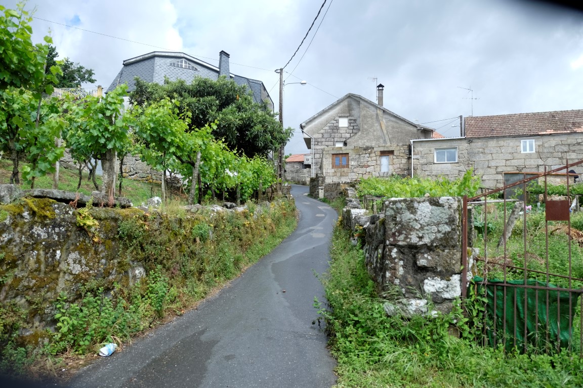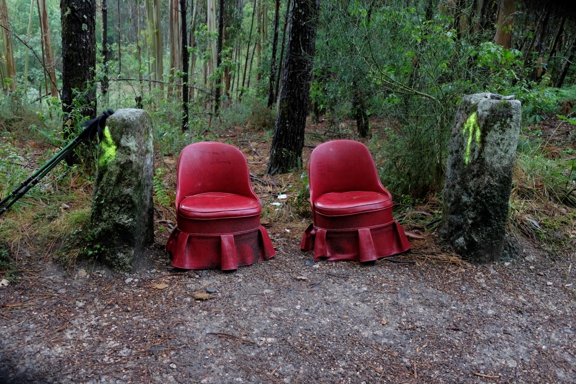 Pēc kafijas pauzes laiks mazu brītiņu mūs saudzē, tad atkal no gaisa sāk krist slapjums. Plānotajā vietā šoseju šķērso Camino, esam atpakaļ pie bultām. Arī autobusa pieturām piemīt līdzīga spēja kā bāriem, to tuvumā sāk līt stiprāk. Apsēžamies vienā no tām un domājam, ko darīt. Apkārt viss ir apmācies, debesīs nav ne mazāko cerību. Esam tuvu domai par autobusu līdz šodienas galamērķim Pontevedrai. Petra aizsūta mājiniekiem nelielu videosveicienu, kā mēs izklaidējamies autobusa pieturā. Pašas smejamies – ja kāds prasīs, kur mēs pavadījām atvaļinājumu, varēsim atbildēt, ka pamatā autobusa pieturās.