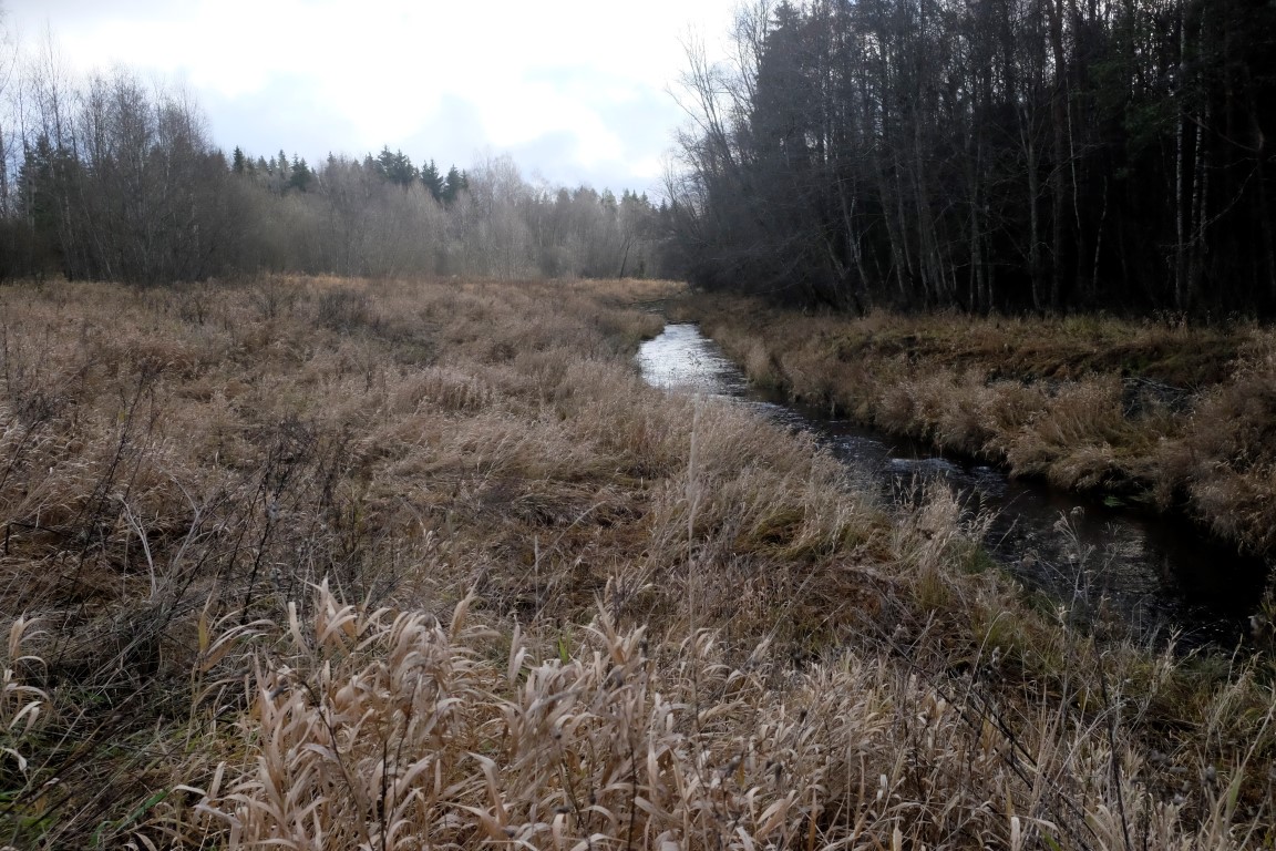 Nu labi, turpināšu iet pa ceļu. Pamazām tas pārvēršas takā ar ūdeni, kurš zem manu zābaku zolēm priecīgi sažļurkstas ar blakus tekošo Aģes upīti. Kad, pēc maniem aprēķiniem, puskilometram jau sen būtu jābūt noietam, bet no akmens nav ne vēsts, ņemu talkā navigāciju. Maps.me stāsta, ka augstāk redzamajā bildē būtu tomēr jāgriež nost gar lauka malu. Tā arī daru – aizmīcos pa arumiem līdz vietai, kur iezīmēta taka. Tā ir aizaugusī pļavā vāji nomanāma taciņa, pa kuru reizi nedēļā pārvietojas bebru ģimene. Nē, laikam tikai viens bebrs. Vai arī ģimene, bet retāk.