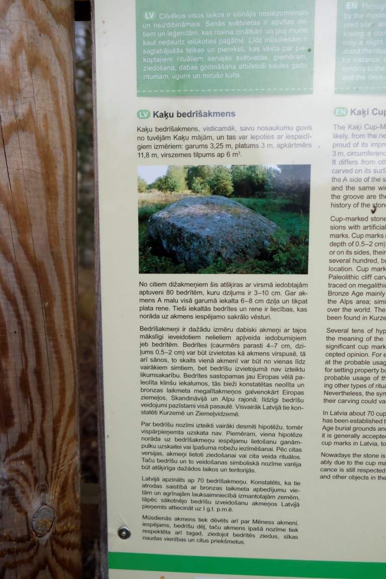 Pa pusei pateicoties bebra minumam, pa pusei navigācijas azimutam, pēc gabaliņa patiešām ieraugu iznirstam akmens pelēci un gana glaunu informācijas stendu blakus. Tajā izlasu, ka kaķi nebūt nav vainojami pie bedrītēm uz akmens, bet gan bijuši par iemeslu netālu māju nosaukumam, kuru vārds pielipis arī akmenim. Par bedrīšu izcelsmi “zinātnieki strīdas” – versijas var palasīt plakāta bildē.