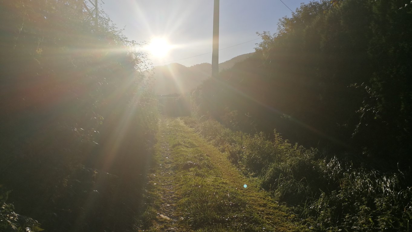 Tad nu brienu tālāk rasā un saullēktā, kas pamazām pārtop vēl vienā siltā dienā. Mēs kopumā tiekam lutināti ar laika apstākļiem, lietu šajās vairāk nekā trīs nedēļās faktiski neesam redzējuši. Dienas vidū piesēžu uz atpūtas kafiju, pēc tās sākas stāva taka augšup. Nomokos pāris posmus, bet tad izpētu, ka otra versija ir iet pa autoceļu, kas ir garāks, bet daudz lēzanāks, tad nu izvēlos šo versiju. Kad takas atkal savienojas, redzu tos pašus divus kungus, kuri parādījās uz takas brīdī, kad es izvēlējos lielceļu – tātad mana izvēle nav bijusi stipri garāka, lieliski!